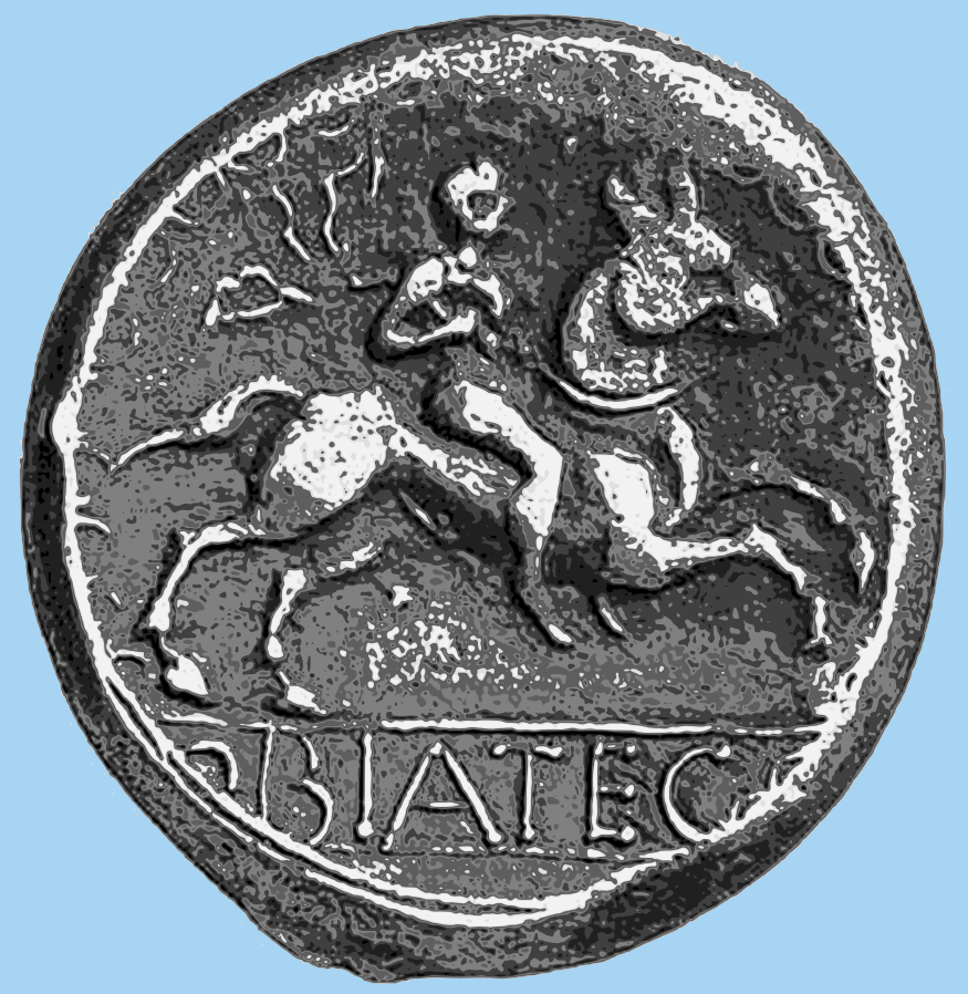 This is a close-up of an old coin, possibly from the Roman Empire. It features a man riding a horse on it, which is a common symbol in ancient coins. The coin appears to be made of metal and has a worn appearance, indicating its age. The man's position on the horse suggests that he might be a warrior or a leader, as horses were often used for transportation and military purposes during those times. This coin serves as a reminder of history and the cultural significance of such symbols in ancient societies.