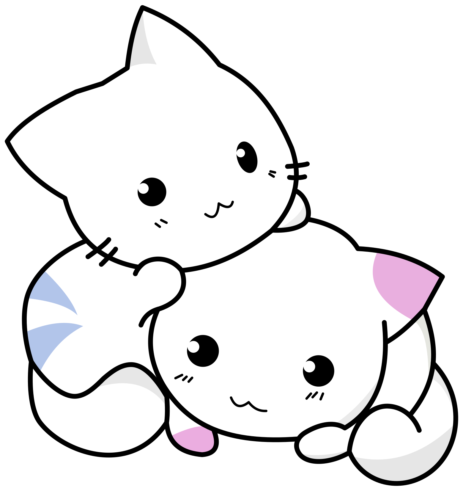 This features a cute cartoon illustration of two white kittens sitting next to each other. They are both wearing pink and blue colors, adding a touch of whimsy to the scene. One cat is positioned on top of the other, creating an adorable and cozy appearance. The overall composition of the image exudes warmth and affection, making it an appealing visual for those who enjoy cute animal illustrations.