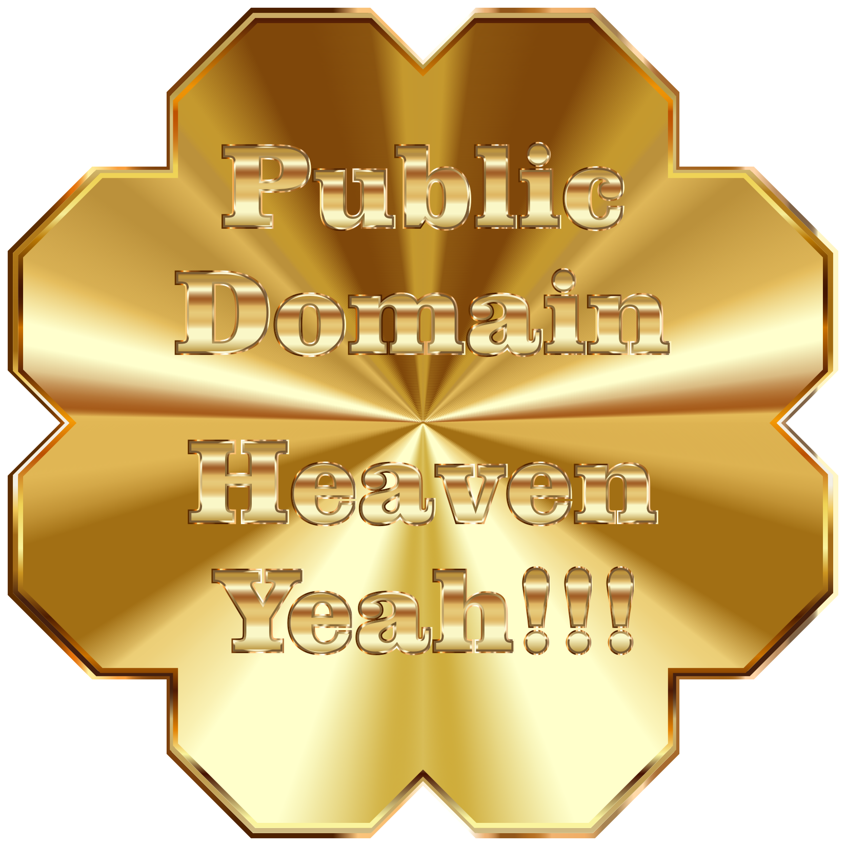 This features a gold circle with the words "Public Domain Heaven Yeah!" written in bold letters. The circle is placed on top of another smaller, golden circle. This design gives an impression of a shiny and eye-catching award or decoration. The phrase "Public Domain Heaven Yeah!" suggests that it might be related to copyrights or intellectual property rights, possibly indicating the owner's approval or endorsement of something related to public domain content.
