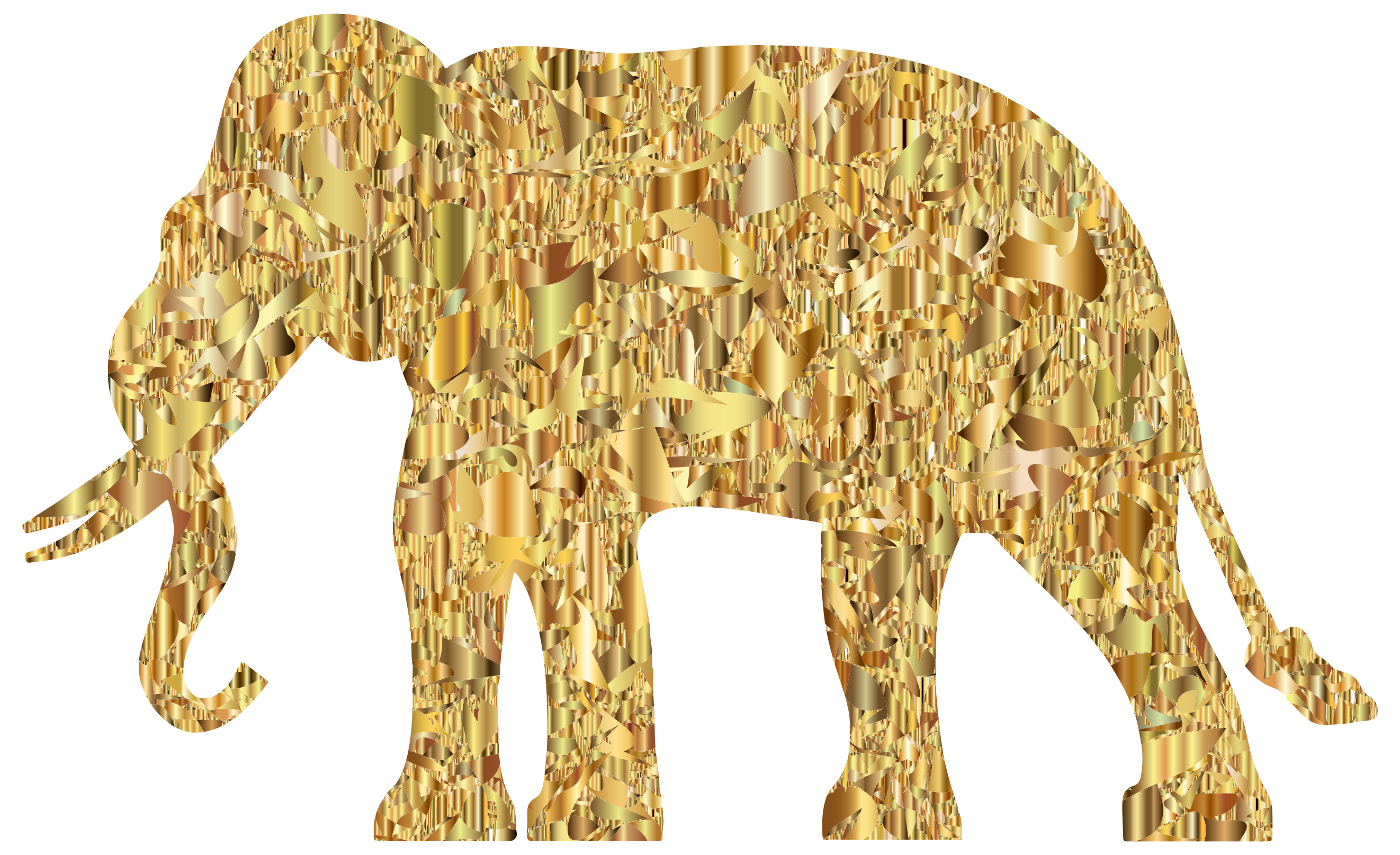 This features a large, golden elephant standing on all fours and facing left. It is made up of numerous gold pieces that are arranged to form the shape of an elephant. These gold pieces create a visually striking representation of this majestic creature. The intricate design of the elephant's body showcases its unique features, making it an impressive piece of artwork.