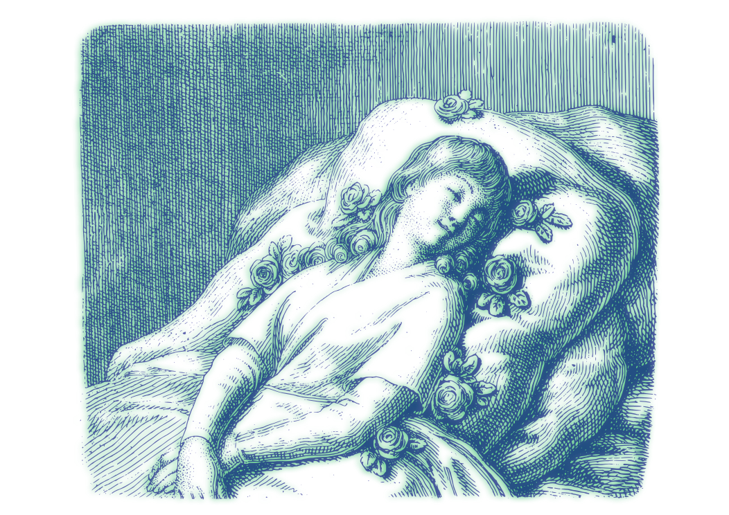 This features a woman lying in bed, possibly sleeping or resting. She is surrounded by numerous flowers that are placed on the pillow and blanket around her. These flowers add a touch of beauty to the scene, creating an overall serene atmosphere. The woman's position suggests she might be enjoying a peaceful moment, perhaps after a long day or before waking up for another one.