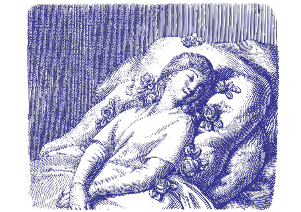 This features a woman lying on her side in bed, with roses adorning the pillow. She appears to be sleeping peacefully and is surrounded by several decorative elements that add charm to the scene. In addition to the roses, there are also two birds present in the picture, one located near the top left corner of the image and another towards the bottom right side. The combination of these elements creates a serene atmosphere, showcasing the woman's relaxed state as she rests on her bed.