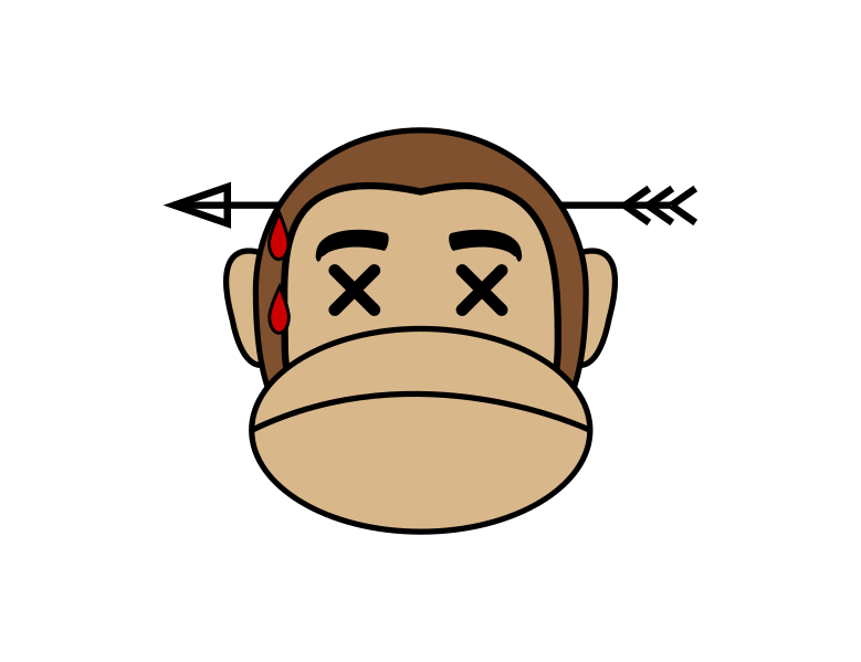 This features a cartoon monkey with an arrow through its head, giving it the appearance of being dead. The monkey's face is covered in blood, adding to the gruesome nature of the scene. This illustration could be used for various purposes such as a warning sign or a piece of artwork. The monkey's facial expression and the arrow through its head create an intense and dramatic visual that captures attention.
