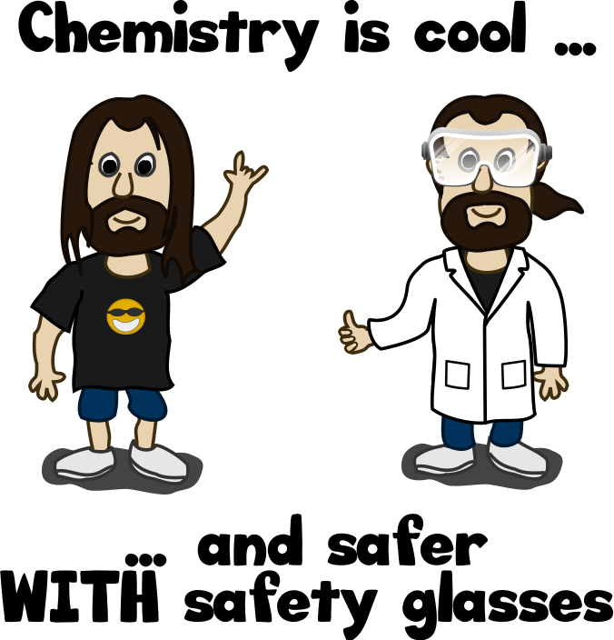 This features two cartoon characters, one dressed in a black t-shirt and the other wearing a white lab coat with safety goggles. They are both pointing upwards, possibly indicating that they are discussing something interesting or important. Above them, there is a text that reads "chemistry is cool...and safer WITH safety glasses." This suggests that the characters might be talking about the importance of wearing safety glasses while working with chemicals or other potentially hazardous materials. The image could be used to promote safety in laboratories or workplaces where such precautions are necessary.