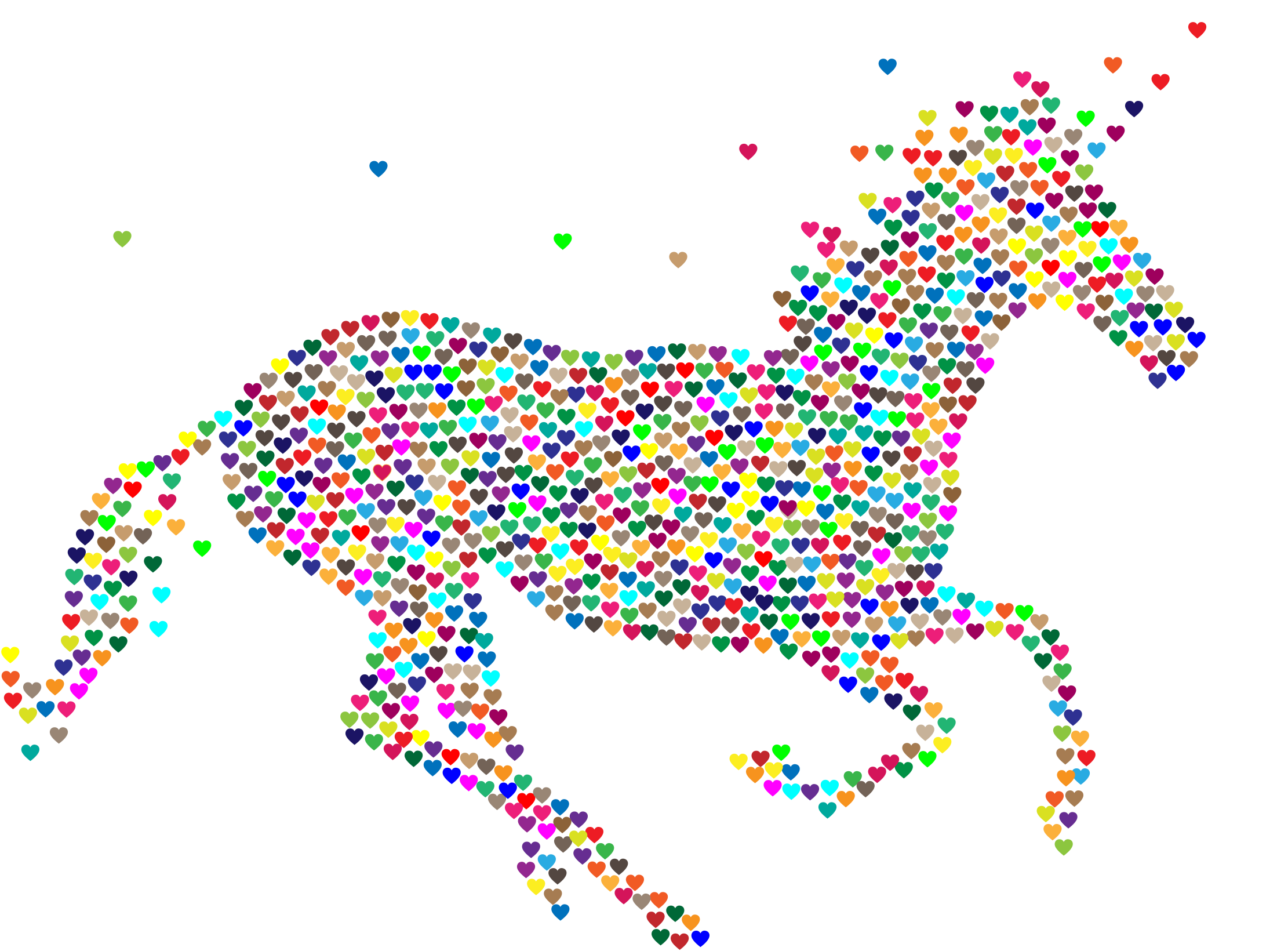 This features a horse silhouette made out of small dots, with the dots varying in color. The horse is depicted from the side and appears to be running or galloping across the scene. The background is white, which provides a clean and contrasting backdrop for the vibrant colors of the dotted horse. This artistic representation of a horse creates an interesting visual effect that captures the viewer's attention.