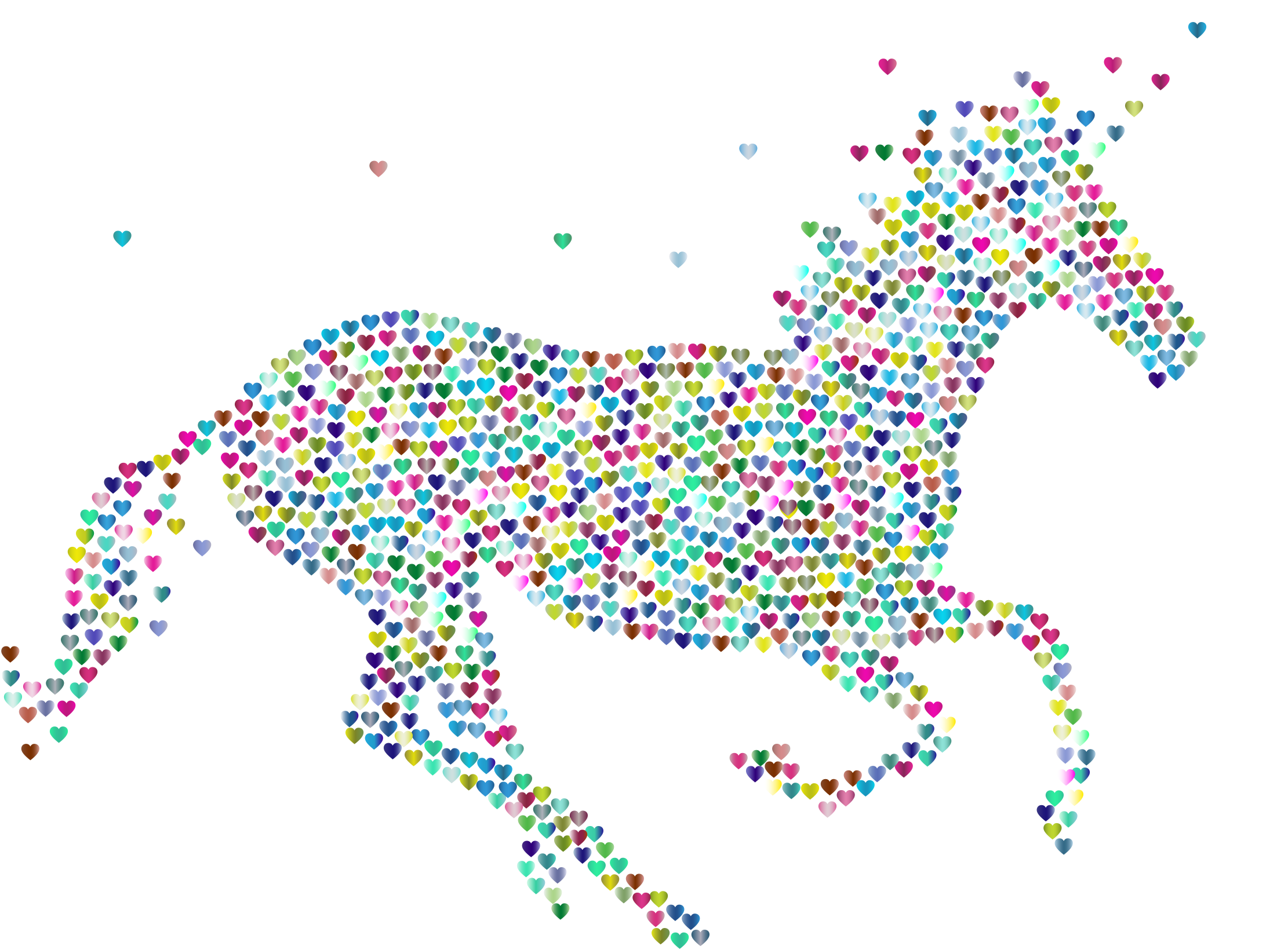 This features a horse with a rainbow of colors on its body. The horse is the main focus, and it appears to be running or galloping across the scene. The horse's body is covered in hearts, which are scattered all over its body, creating a visually appealing and playful effect. The hearts come in various sizes and positions, adding depth and interest to the overall composition of the image.
