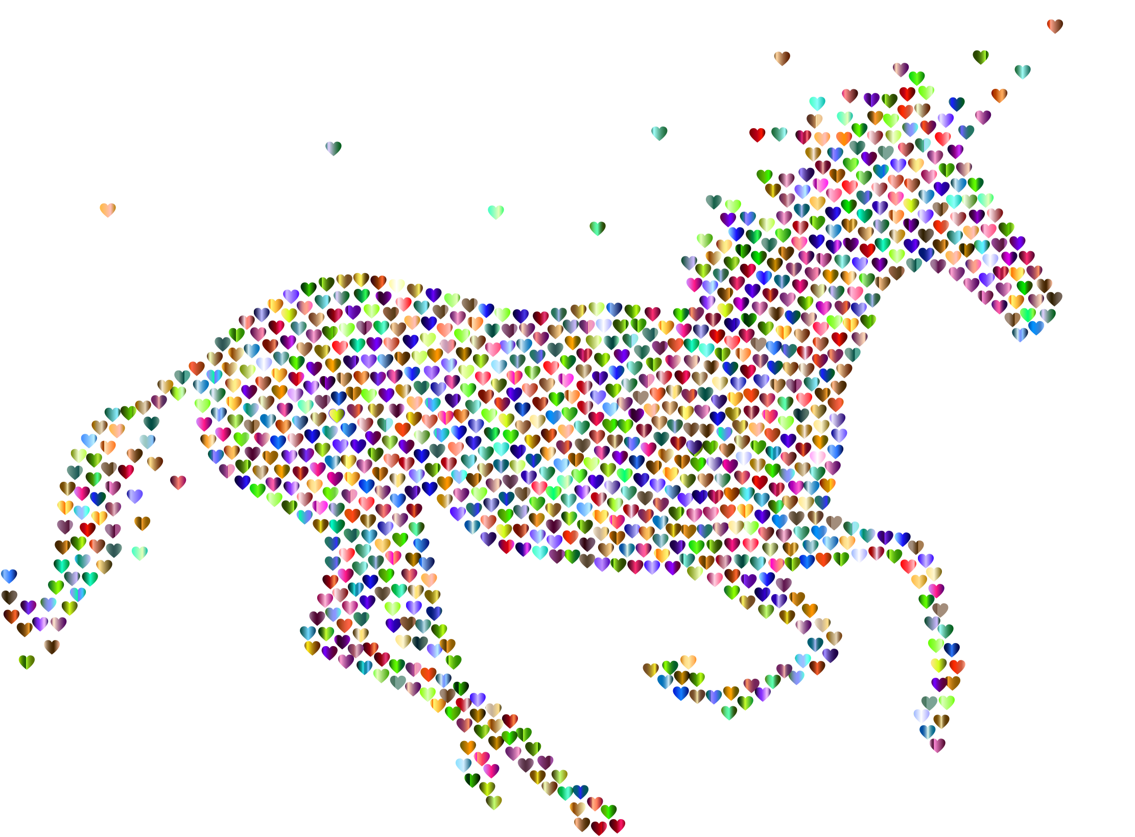 This features a horse made out of small dots, with the dots varying in color. The horse is depicted from the side and appears to be running or galloping across the screen. The background is white, providing a clean and uncluttered appearance for the horse's vibrant colors. This unique artwork showcases the creativity of using small dots to form an eye-catching image of a horse in motion.