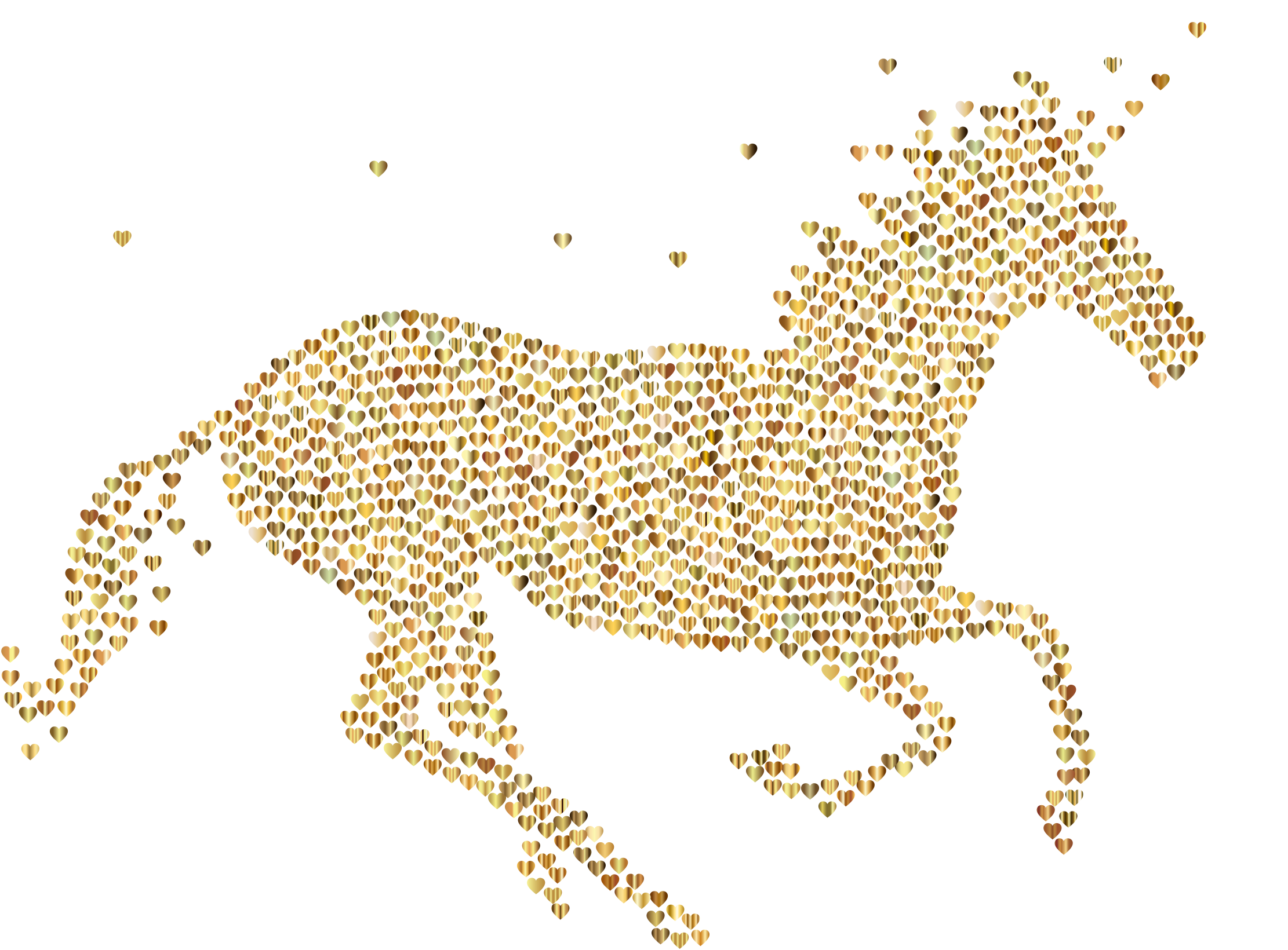 This features a beautifully crafted illustration of a gold unicorn running towards the right. The unicorn's body is made from tiny hearts in different shades of gold, creating an intricate and visually appealing design. These hearts are scattered all over the unicorn's body, with some placed on its head, neck, legs, and tail. The hearts vary in size and position, adding depth and dimension to the overall appearance of the illustration. This unique artwork showcases a creative approach to depicting a mythical creature while incorporating a playful and charming element through the use of hearts as the primary design element.