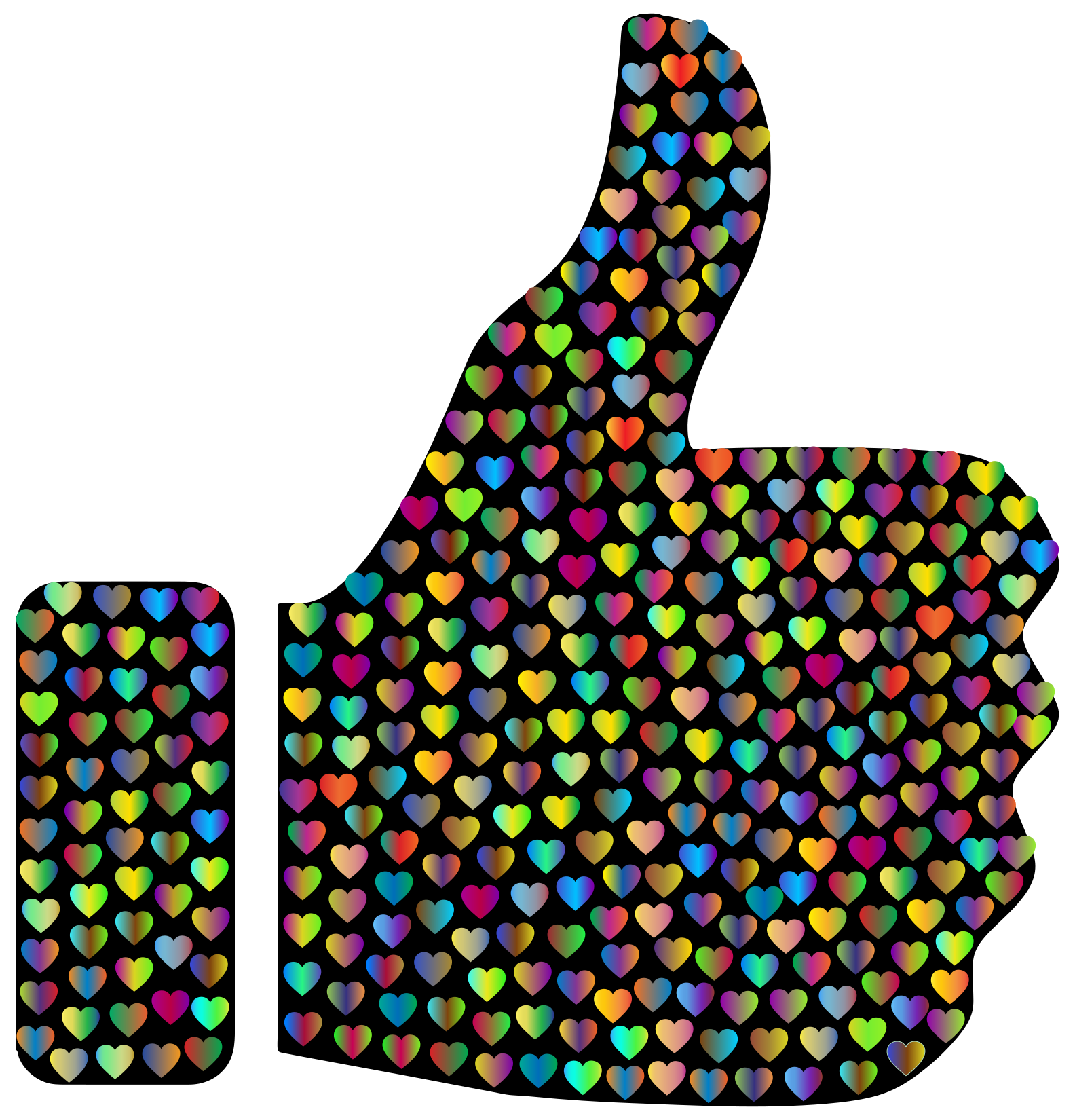 This features a large, colorful thumbs up sign made of many small hearts. These hearts are arranged in various shapes and sizes, creating an eye-catching pattern that covers the entire sign. The vibrant colors of the hearts make it stand out against its background, which appears to be white or light brown. This unique design could be used for a variety of purposes, such as promoting positivity, encouraging creativity, or simply adding a fun and playful touch to any space.