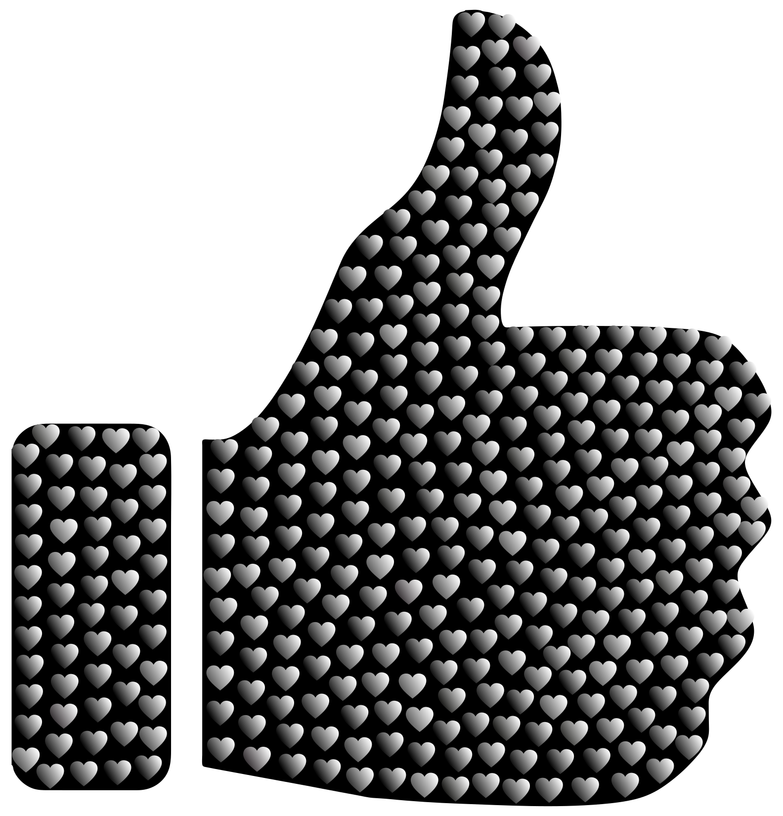 This features a large, black and white thumbs up sign made of hearts. The heart-shaped pieces are arranged in such a way that they create the appearance of a thumbs up gesture. This unique design adds a playful touch to the classic symbol. The hearts are scattered throughout the entire image, with some located near the top, middle, and bottom areas of the sign. Overall, it is an interesting and creative take on a traditional thumbs up sign.