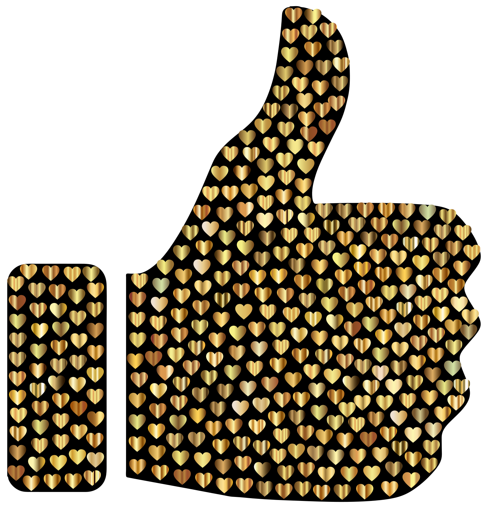 This features a large, golden thumbs up sign made of hearts. The hearts are arranged in various sizes and positions, creating an eye-catching pattern that resembles a thumbs up gesture. The hearts are scattered all over the sign, with some located near the top, middle, and bottom areas. This unique design makes for an interesting and creative way to convey positivity or approval.