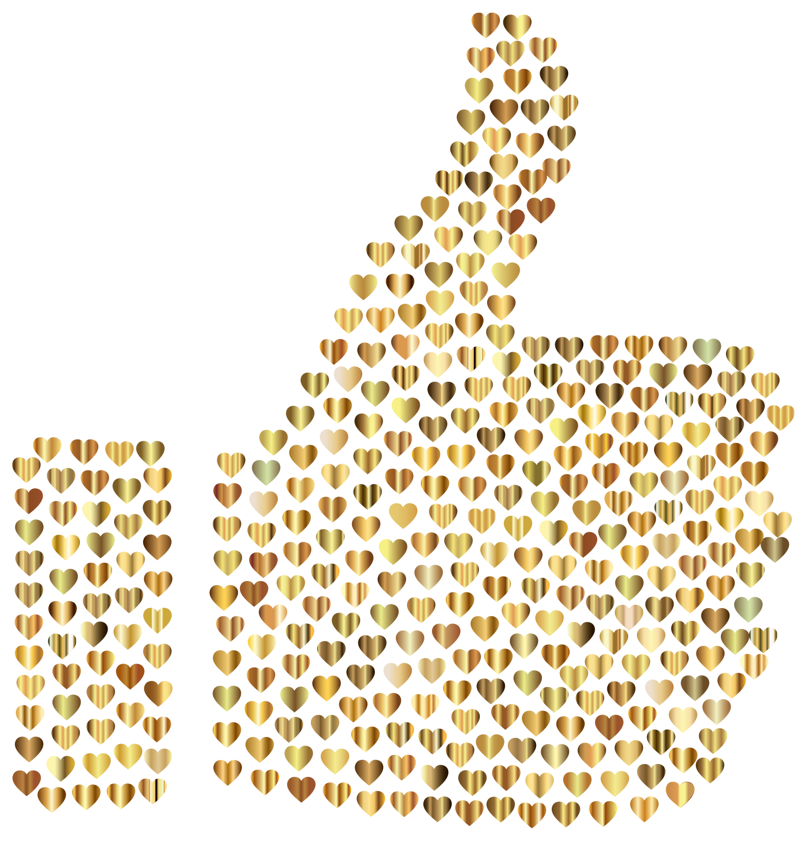 This features a large thumbs up symbol made out of numerous small hearts. These hearts are arranged in various positions, creating the illusion of a single, unified heart shape. The hearts are all shades of gold and have a glossy appearance, giving the overall design an elegant and sophisticated look. This unique representation of a thumbs up is both visually appealing and creative, making it an interesting focal point in any setting.