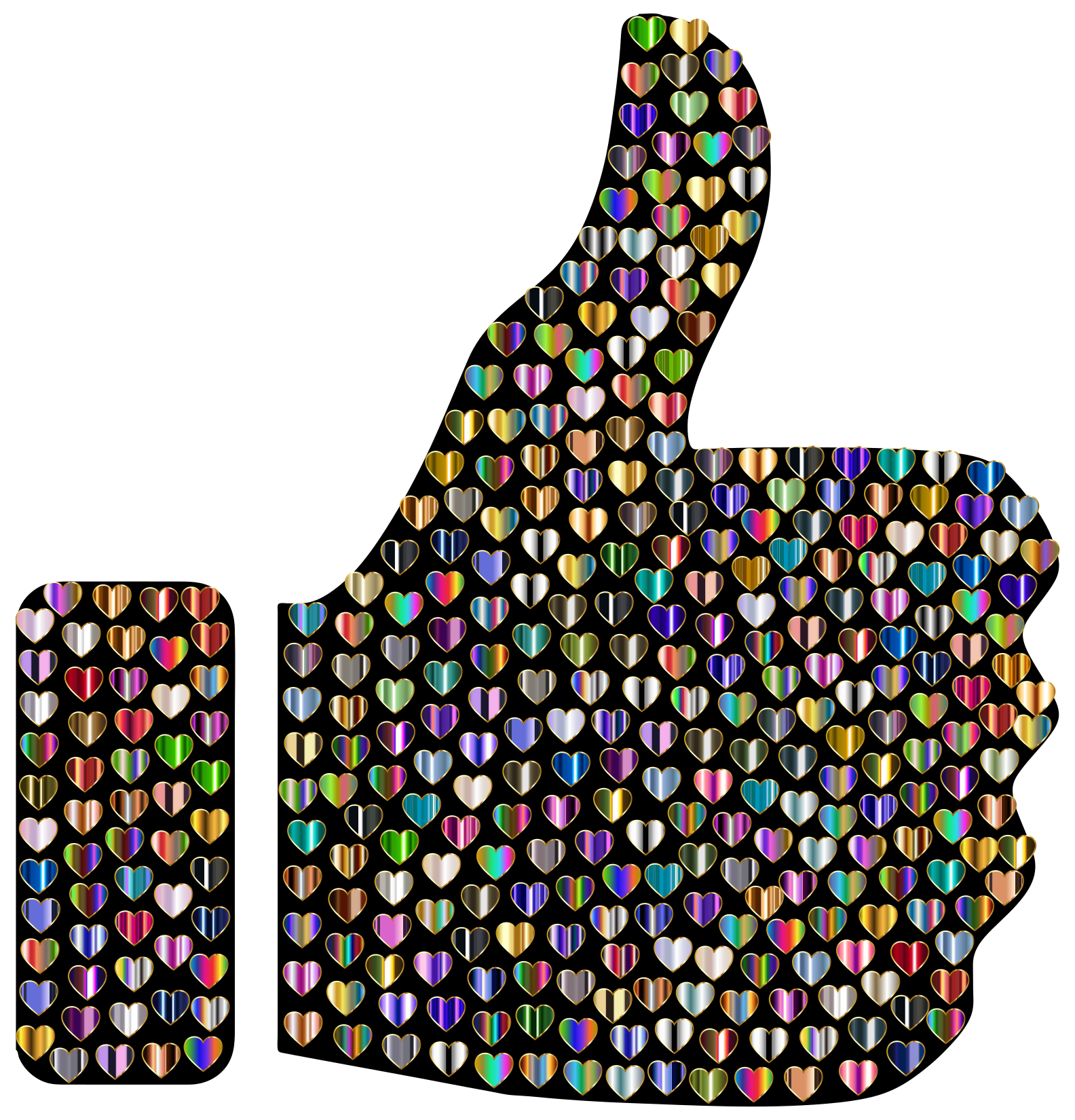 This features a large, colorful thumbs up sign made of various colored hearts. These hearts are arranged in a pattern that creates the appearance of a thumbs up symbol. The hearts come in different shades and sizes, adding to the vibrant nature of the design. This unique and eye-catching display is likely meant to convey positivity or approval, making it an interesting visual element for any setting.
