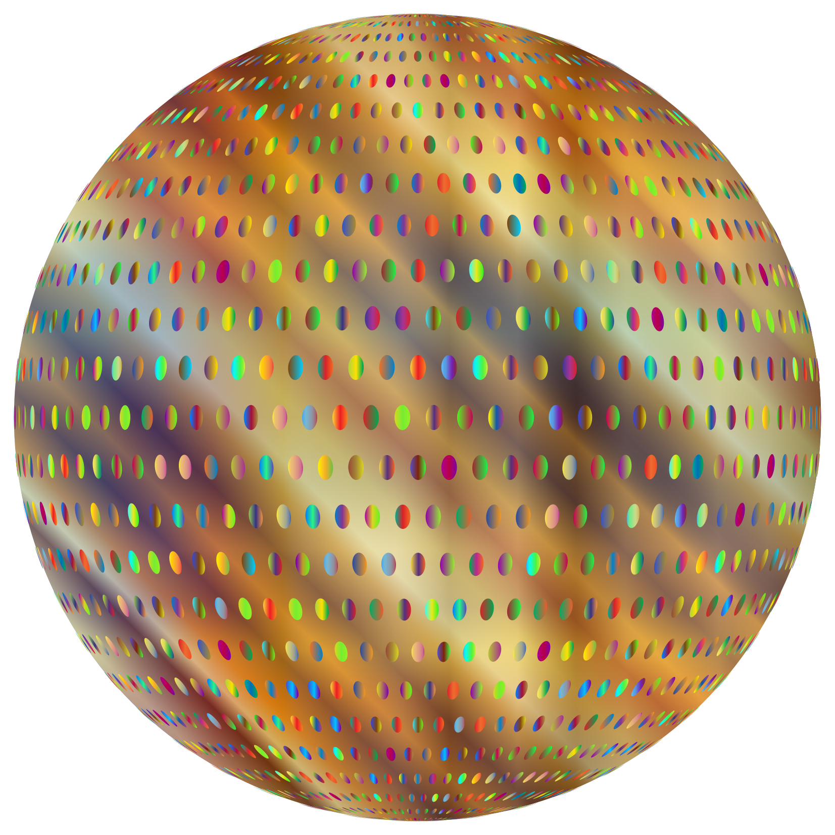 This features a large, colorful sphere with a multitude of small dots covering its surface. These dots are of various colors and sizes, creating an eye-catching pattern that gives the sphere a unique and vibrant appearance. The combination of the golden hue and the rainbow colored dots creates a visually striking contrast against the background, making it an interesting focal point in the image.