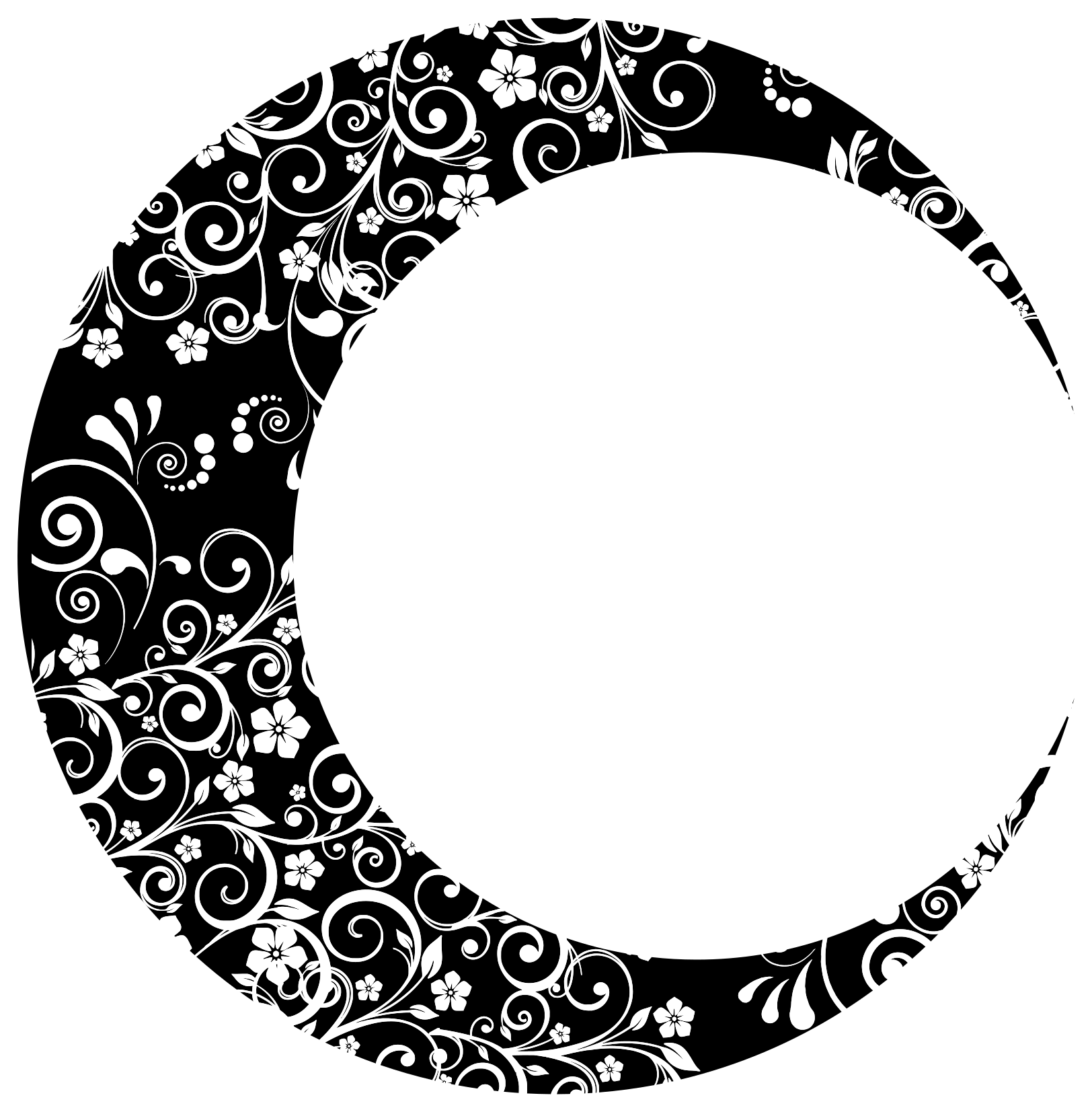 This features a black and white design of a crescent moon with a white background. The moon is adorned with various white flowers and vines, creating an intricate and visually appealing pattern. The combination of the contrasting colors and delicate details make this design stand out as a unique and eye-catching piece of artwork.