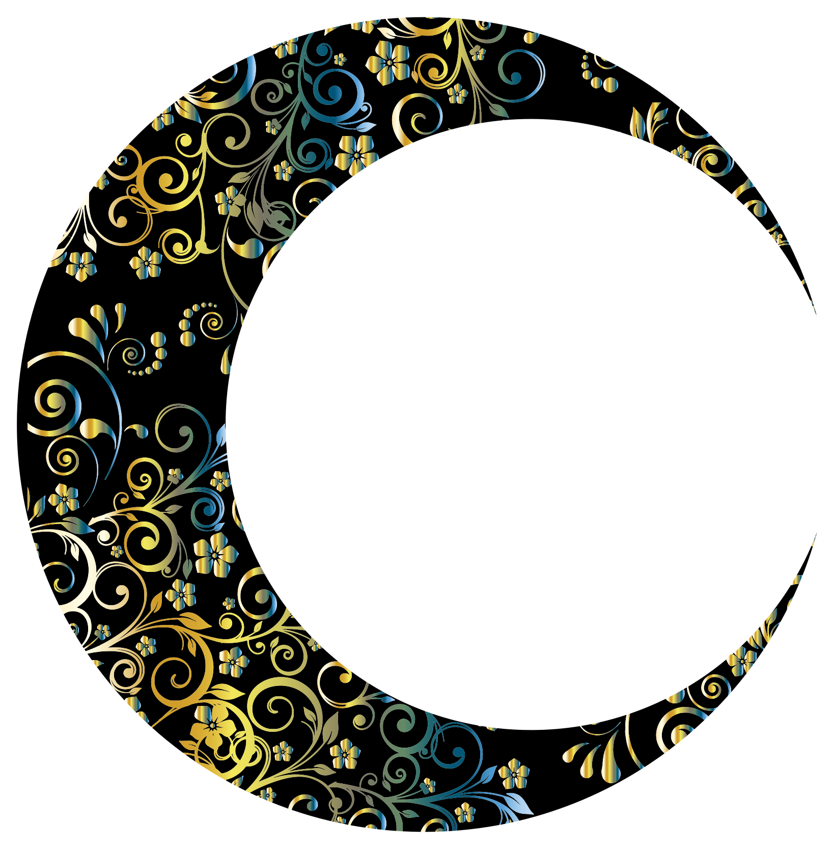 This features a large, decorative moon with a black background and intricate floral patterns. These patterns are blue and yellow in color, adding a vibrant touch to the overall design of the moon. The moon is positioned at the center of the image, drawing attention to its unique appearance. The combination of the black background and the colorful floral patterns creates an eye-catching visual effect that makes this moon stand out as a piece of art or decoration.