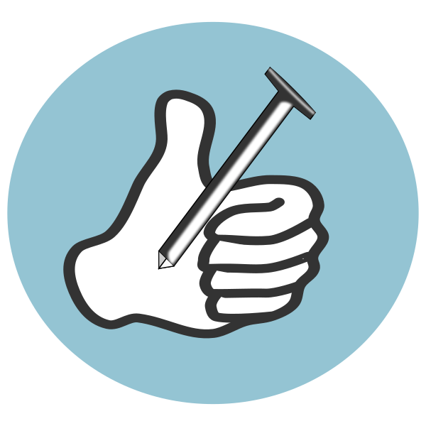 This features a white hand giving a thumbs up, with the thumb pointing towards a nail. This creative representation of a thumbs up is accompanied by an actual nail in the background. The hand and nail are placed on a blue circle, which serves as the background for this unique illustration.