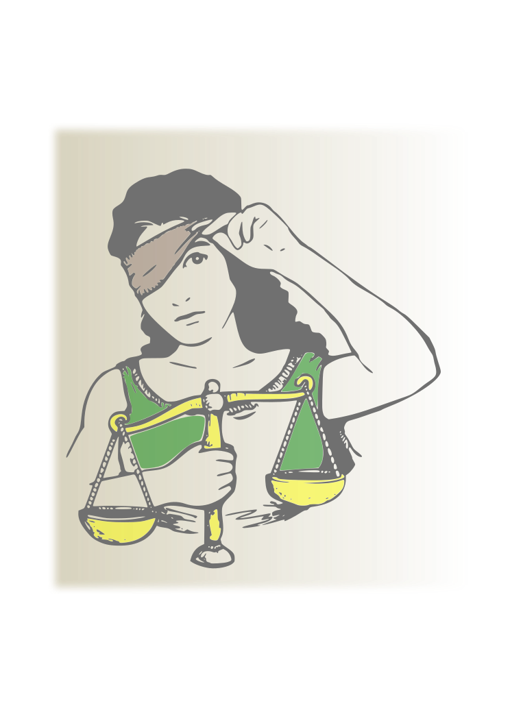 This features a woman with a blindfold on her eyes, holding a scale in one hand and a book in the other. She appears to be wearing a green dress and is standing in front of a wall. The scene gives off an artistic vibe, as if it were a painting or drawing. The woman's blindfold adds a sense of mystery to her appearance, making her seem like a figure from mythology or folklore.