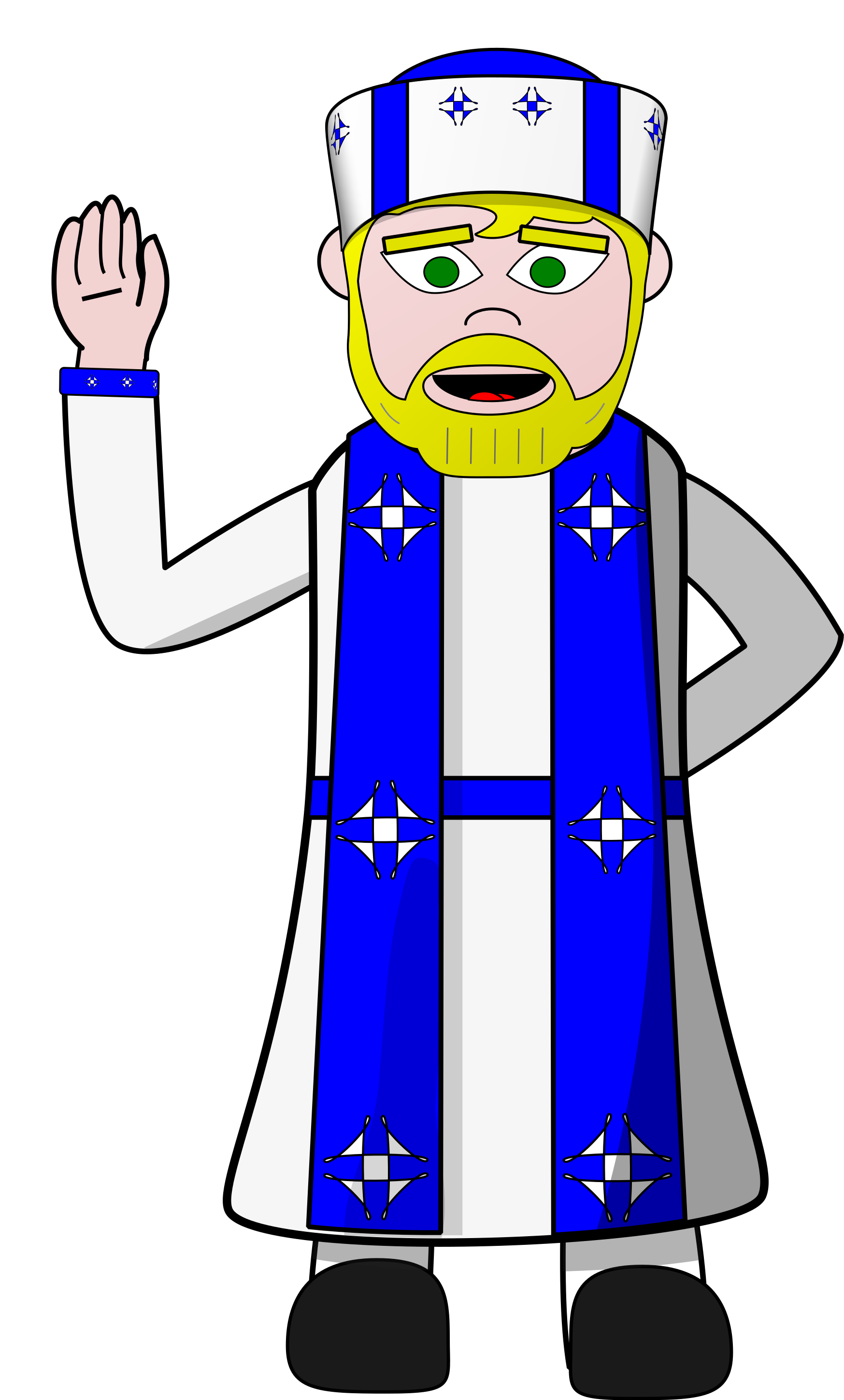 This features a cartoon drawing of a man wearing a blue and white robe, with his hand raised in the air. He appears to be waving or gesturing towards something off-camera. The man's attire suggests that he might be a priest or a religious figure. The overall style of the drawing is simple yet effective, capturing the essence of the subject matter without excessive detail.