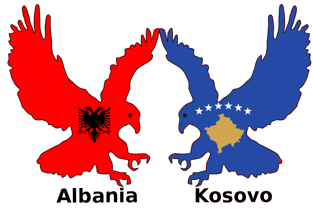 This features two eagles, one red and the other blue, with their wings spread wide. They are positioned above a map of Albania and Kosovo, which is located below them. The eagles appear to be in a battle or confrontation, as they face each other with their wings open. This image could represent the rivalry between these two countries or symbolize strength and power.