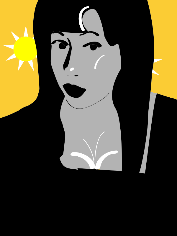 This features a woman with dark hair and makeup, wearing a black shirt. She is looking upwards, possibly at the sun or another point of interest. Her lips are painted red, adding to her striking appearance. The woman appears to be in a colorful setting, as there is a yellow background behind her. Additionally, there is an orange and white sun visible in the upper left corner of the image, further enhancing the vibrant atmosphere.