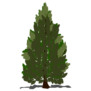 This features a large, green tree with a short brown stem. It has a big crown that is green in color and has a pointy end. The tree appears to be the main focus of the scene, standing tall against a white background. Its size and vibrant colors make it an eye-catching element within the image.