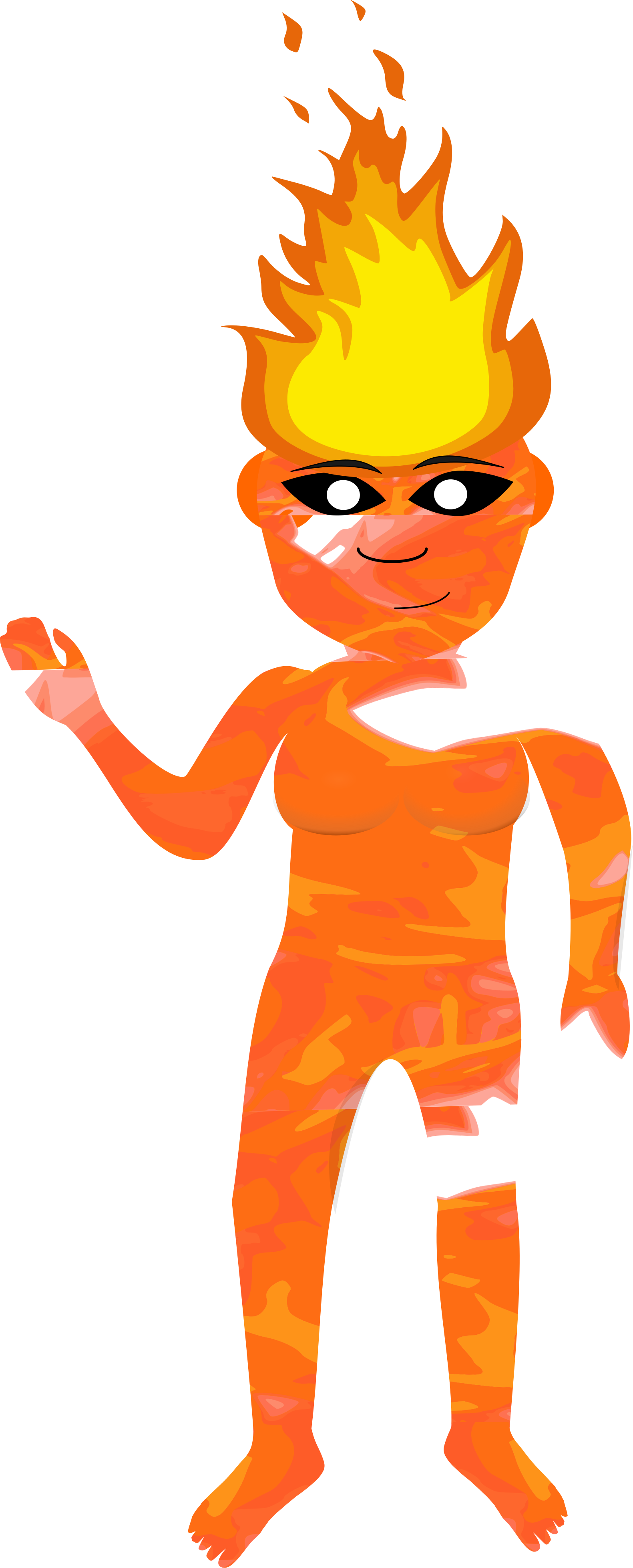 This features a cartoon-like character with an orange body and flaming hair. It appears to be a fire elemental, possibly from a fantasy or comic book setting. The character is standing in front of a brown background, which contrasts well with the vibrant colors of the fire elemental. The design of this character showcases its unique features, such as the flaming hair and orange body, making it an interesting and eye-catching image.