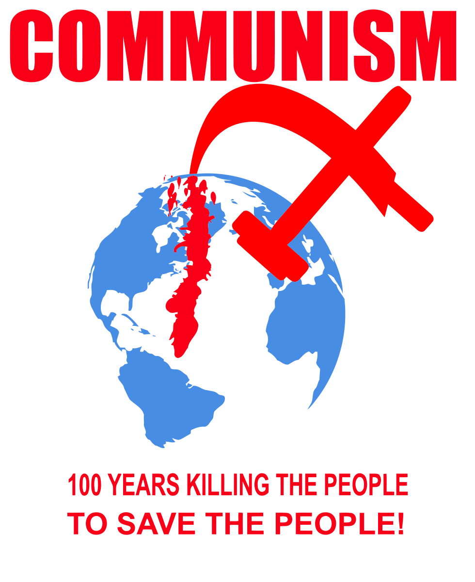 This features a red and blue poster with the words "Communism" written in bold white letters. Above the word "Communism," there is an image of a hammer and sickle, which is a symbol commonly associated with communist ideologies. In addition to this, there are two slogans on the poster: one that reads "100 Years Killing The People" and another that says "To Save The People!". These phrases suggest that the poster is expressing opposition to communism or making a statement about its negative impacts.