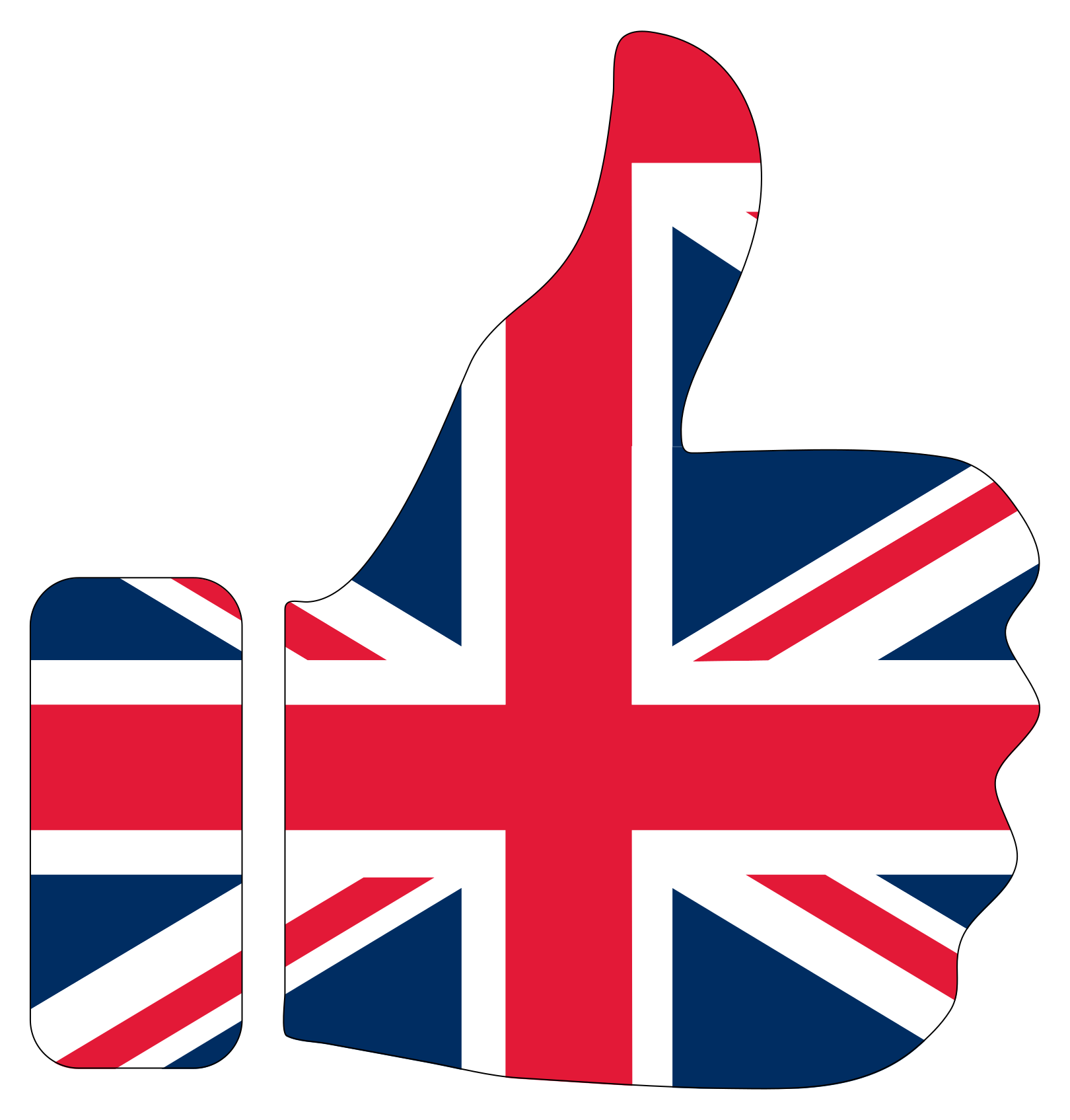 This features a thumbs up sign with the United Kingdom's Union Jack flag. The flag is prominently displayed in the center of the thumbs up, creating an interesting and unique design. This creative combination of symbols represents a positive message or sentiment, as the thumbs up sign is often used to express approval or agreement. The use of the Union Jack flag adds a touch of national pride and identity to this symbolic representation.