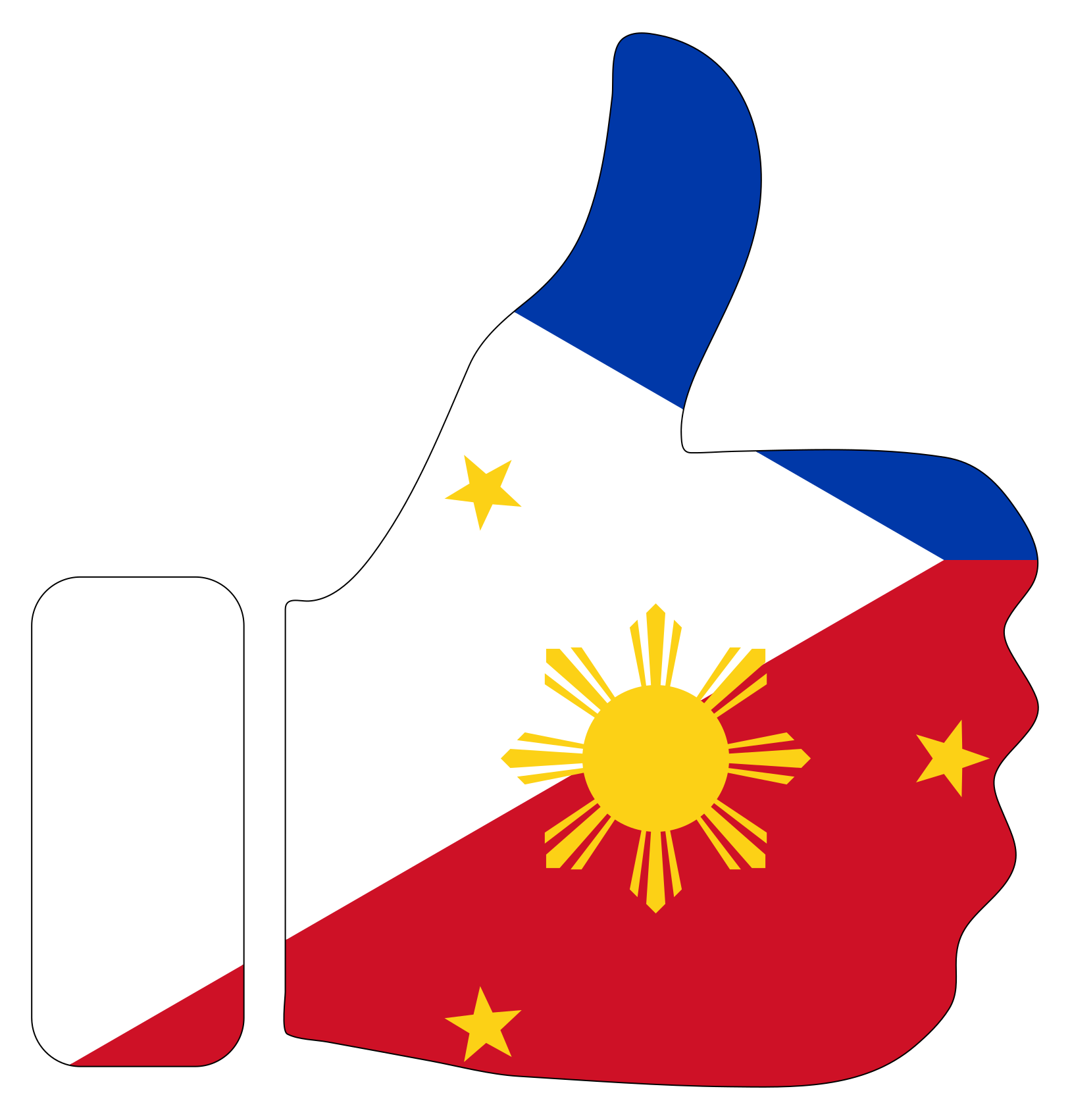 This features a thumbs up symbol with the outline of the Philippines flag. The flag is red, white and blue, and it has a yellow sun on one side. This unique design combines the popular thumbs up gesture with the national flag of the Philippines, creating an eye-catching and patriotic display.