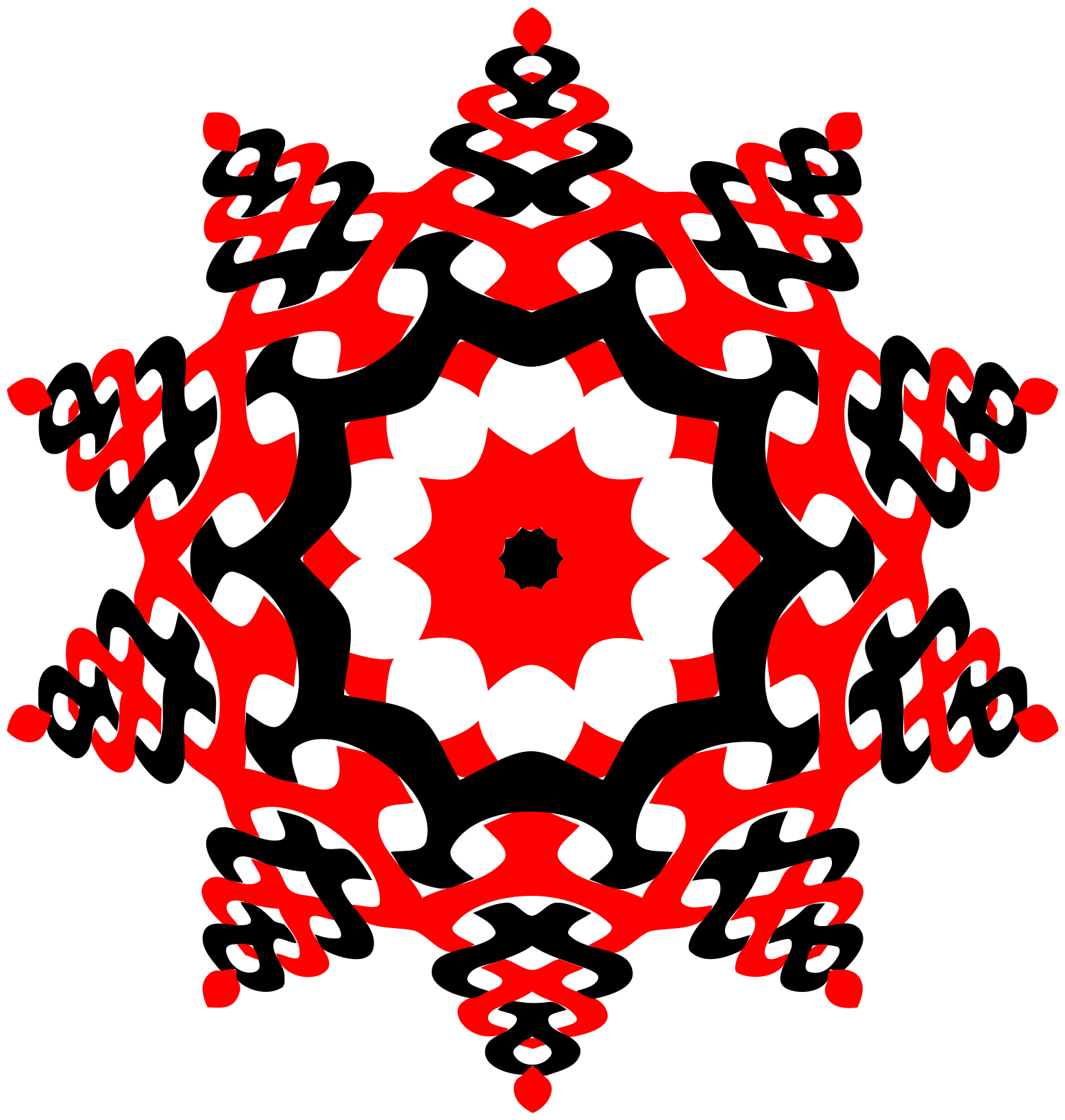 This features a large, intricate red and black star pattern. The star has ten points, each point is made out of entangled red and blue lines. The center of the star is red colored, creating an eye-catching focal point in the design. The overall appearance of the star is quite complex, with many interconnected lines and patterns that make it visually appealing.