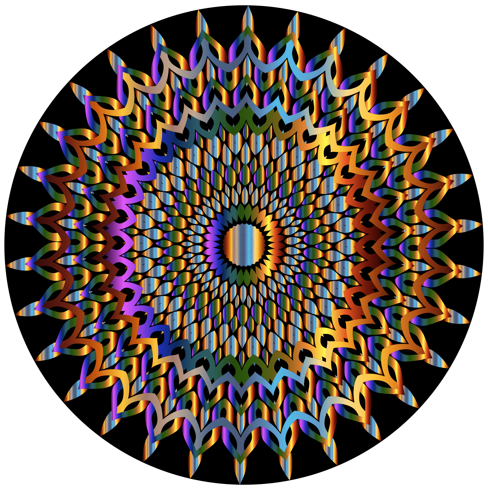 This features a large, colorful circle with an intricate design. The circle is filled with various shapes and patterns that are vibrant in color, creating a visually striking scene. These shapes include different shades of blue, yellow, orange, and purple, all combined to create a unique and captivating pattern. The circle's design appears to be inspired by the artistic style of M. C. Escher, known for his intricate and complex geometric patterns. Overall, this image showcases an impressive display of colorful shapes and patterns that are both visually appealing and thought-provoking.