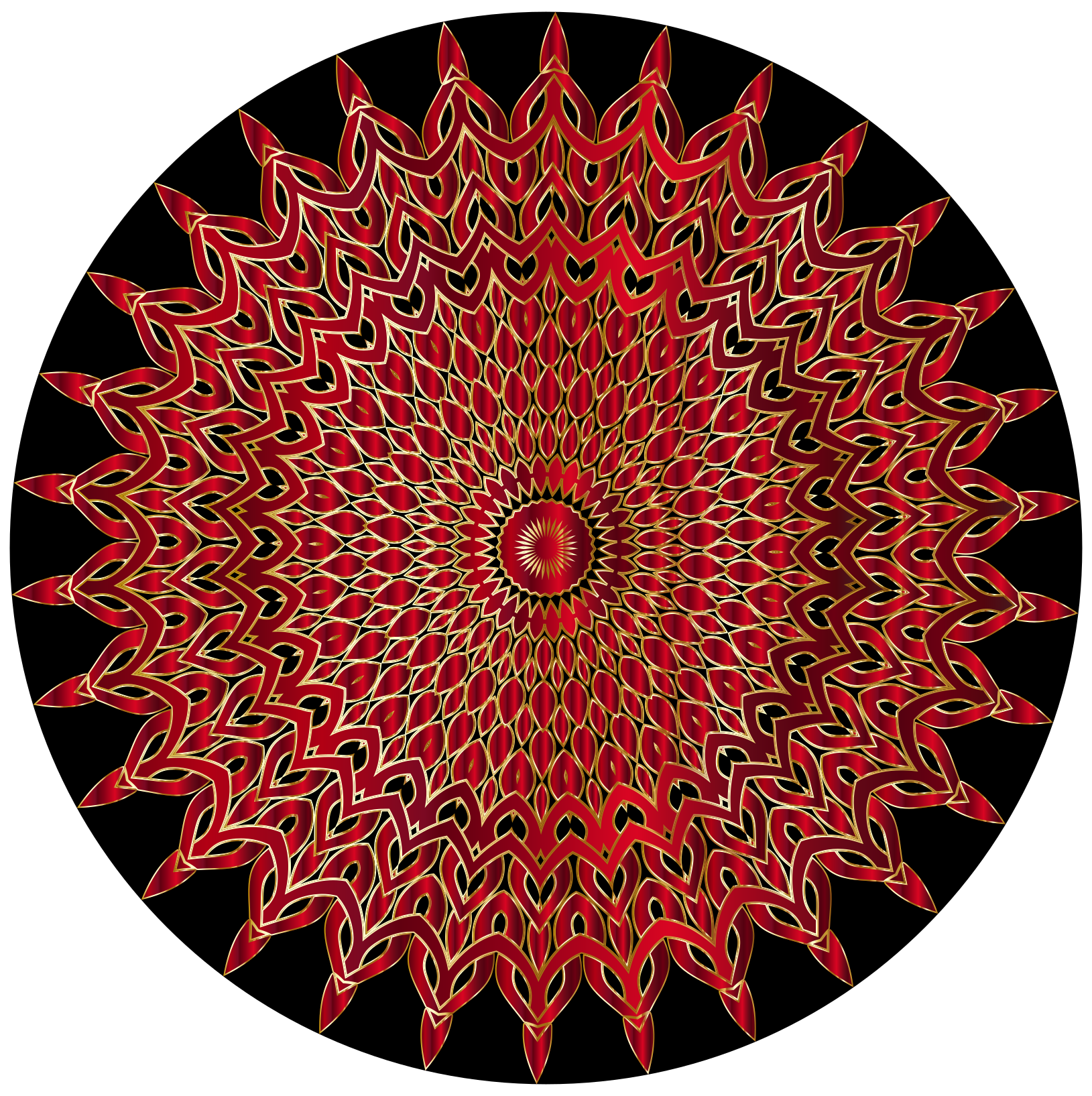 This features a large, round, and intricate design that resembles an abstract knot circle. The design is predominantly red in color, with some black accents adding contrast to the overall appearance. The pattern appears shiny, giving it a visually appealing quality. The edges of the design are pointy, which adds to its unique and eye-catching appearance. Overall, this artistic piece showcases an impressive blend of color, shape, and texture that makes it stand out as a captivating visual display.