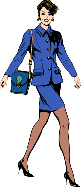 This features a woman dressed in a blue business suit, wearing a jacket and carrying a purse. She is walking confidently with her hands on her hips, exuding an air of professionalism. Her attire includes a skirt and high heels, which further accentuate her polished appearance. The woman's outfit suggests that she might be in the corporate world or attending a formal event. The overall scene is reminiscent of a comic book illustration, with the woman being the central focus and the background appearing somewhat blurry.
