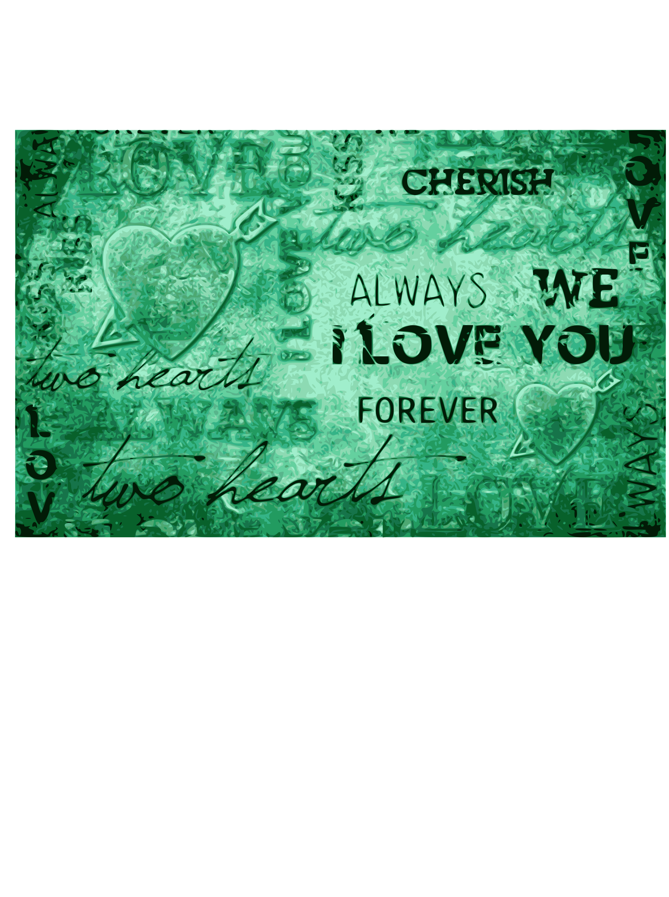 This is a green and white poster that reads "Always we love you forever." It features hearts in various sizes, with some larger ones placed at the top of the poster and smaller ones scattered throughout. The words are written in a cursive style, giving it an old-fashioned appearance. This sentimental poster could be used to express affection or remind someone that their love is always cherished.
