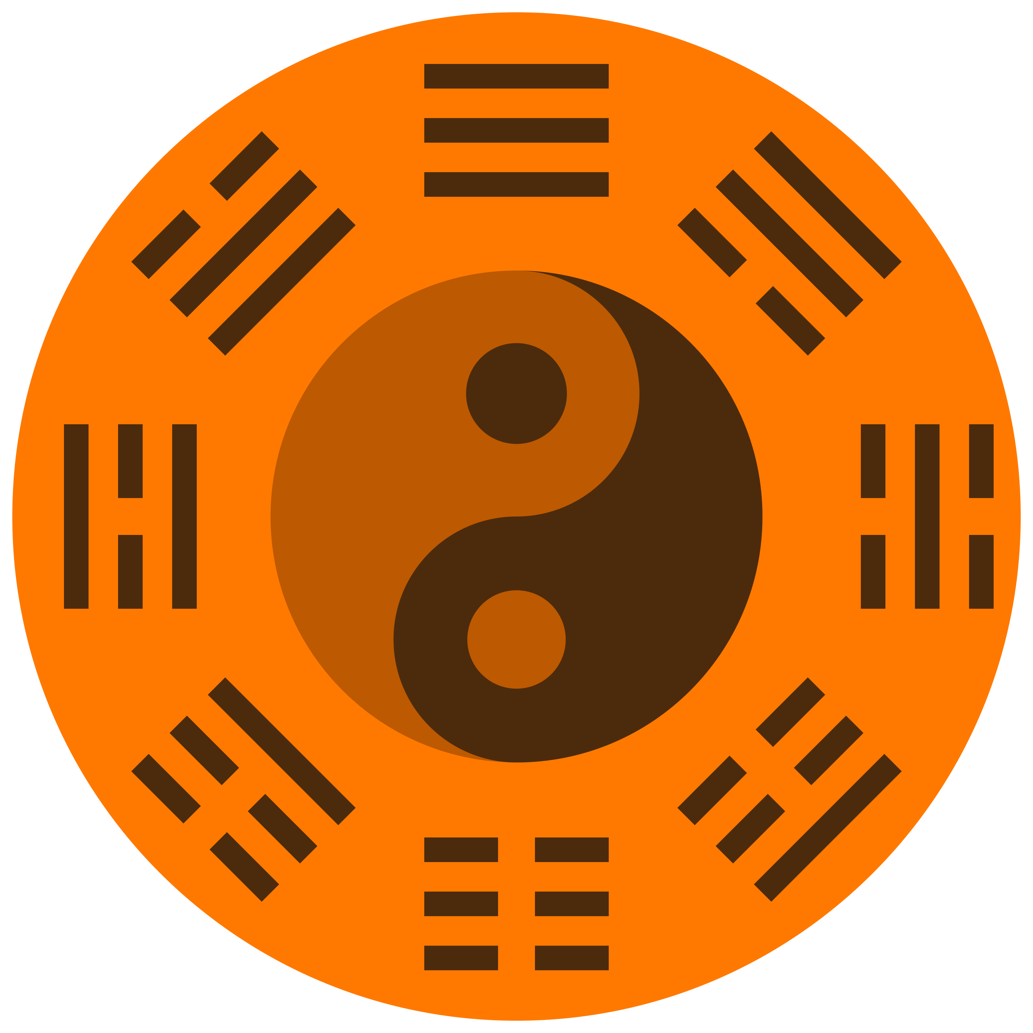 This features an orange circle with a yin-yang symbol in the center. Surrounding the yin-yang sign are eight different black symbols made from lines, which represent the Bagua. These symbols are used in Taoist cosmology and are arranged around the central yin-yang sign to create a harmonious balance of energy. The circle itself is an intricate design that showcases the interconnectedness of these symbols, making it an interesting and visually appealing piece of art or decoration.