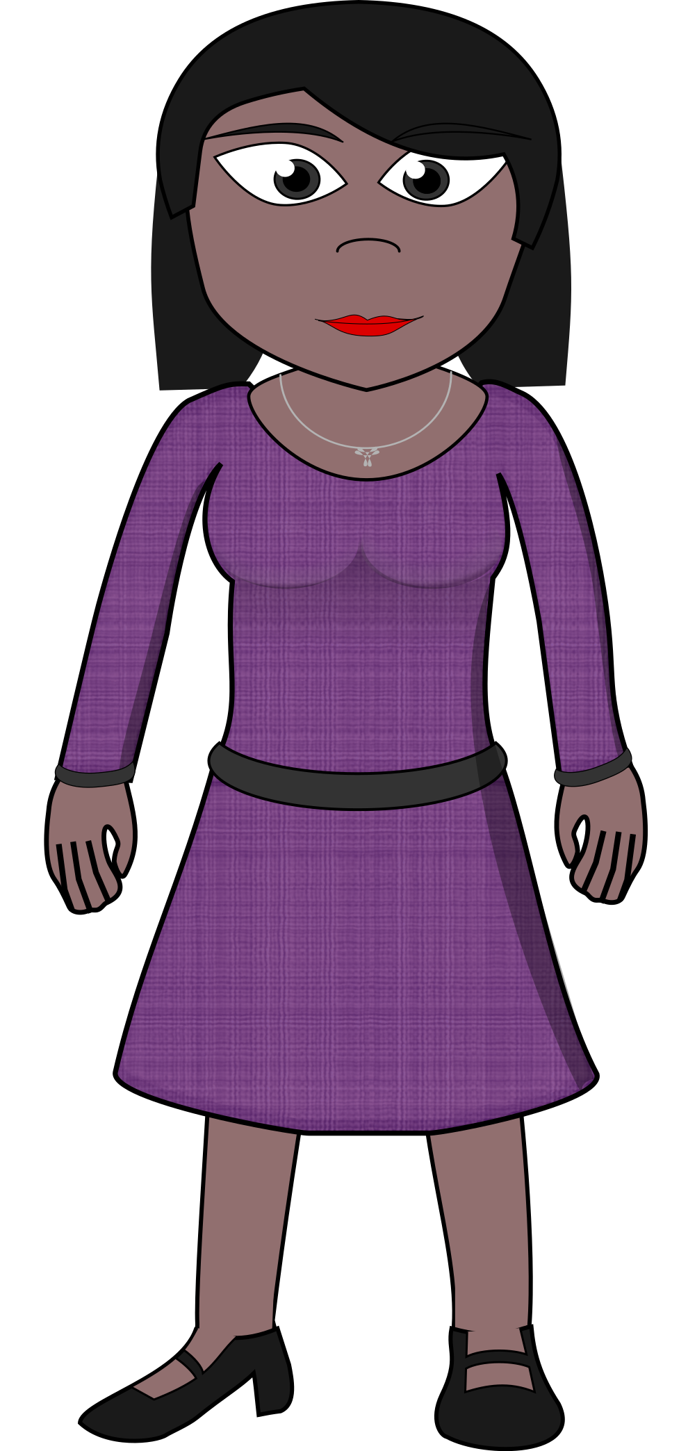 This features a woman wearing a purple dress and black shoes. She is standing in front of a wall, possibly posing for the picture. Her outfit includes a necklace around her neck, adding an elegant touch to her appearance. The woman's expression appears somewhat disgruntled or unenthusiastic, which might suggest that she is not particularly happy about something. Overall, the image captures a moment in time with this woman dressed up and standing against a wall.
