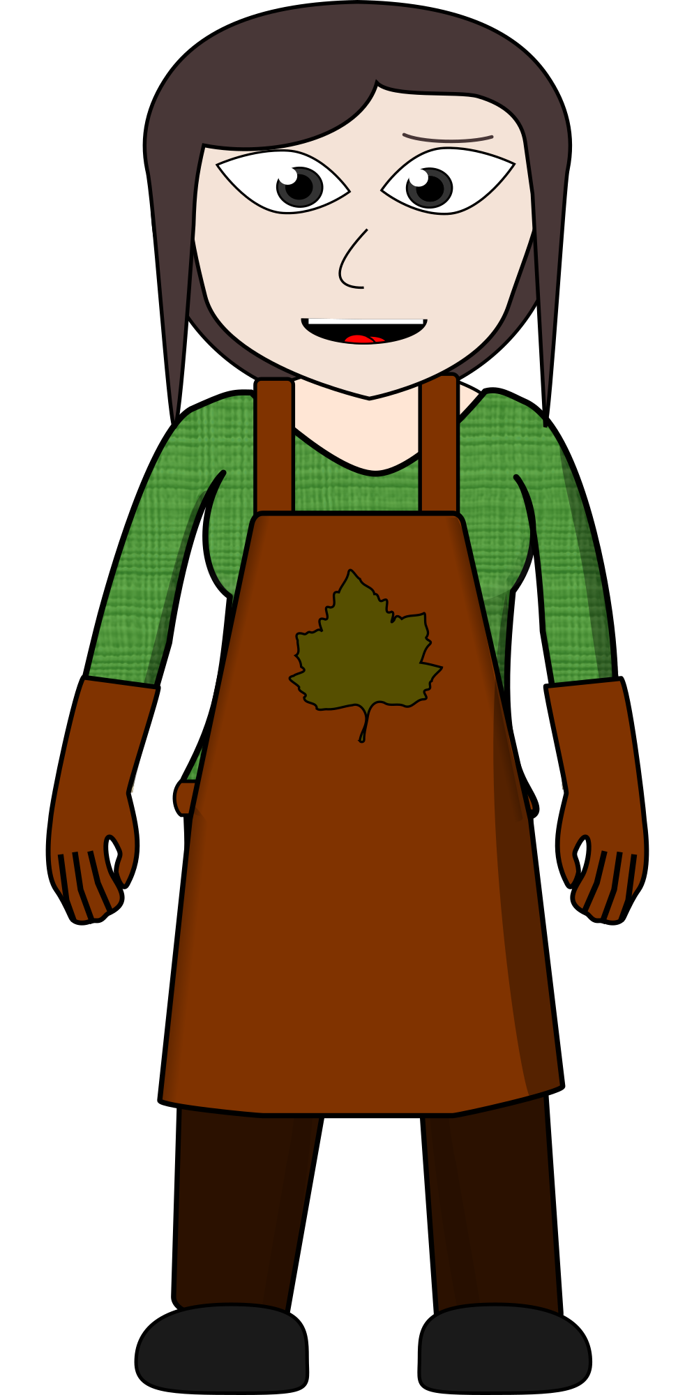 This features a cartoon woman wearing an apron and gloves, standing in front of a brown background. She is holding her hands on her hips, giving off a confident and determined vibe. Her apron has a leaf design, adding to the overall theme of the scene. The woman's attire suggests that she might be involved in some sort of gardening or outdoor activity.