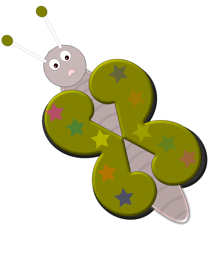 This features a green and yellow butterfly with stars on its wings. It is positioned in the center of the scene, occupying most of the frame. The butterfly has a unique design, making it stand out against the background.