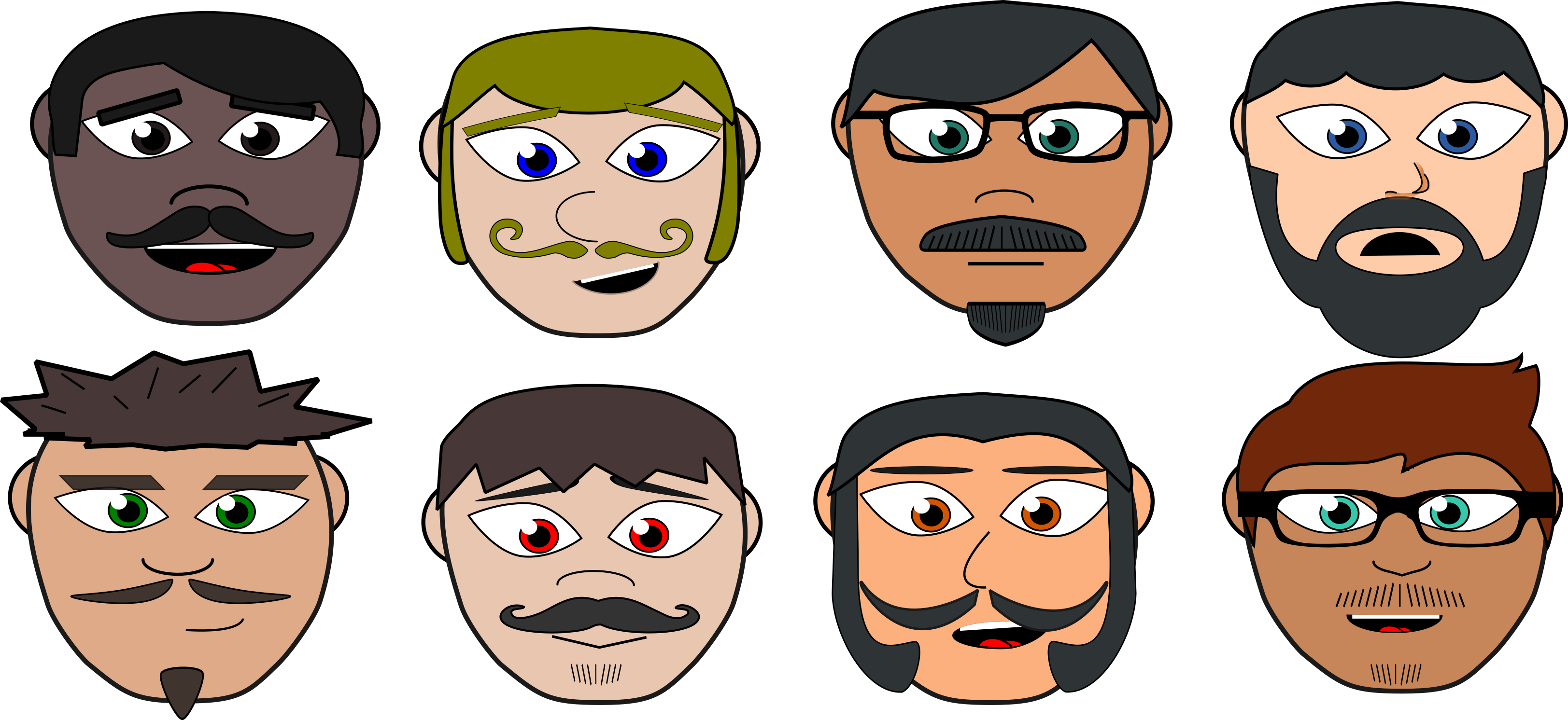 This features a collection of eight different colored cartoon heads, each with unique facial hair and accessories. These heads are arranged in a row, showcasing their distinctive characteristics. Some of the heads have mustaches, while others sport beards or goatees. Additionally, some of the heads are adorned with glasses, adding to the diversity of the collection. The arrangement of these cartoon heads creates an interesting and visually appealing display.