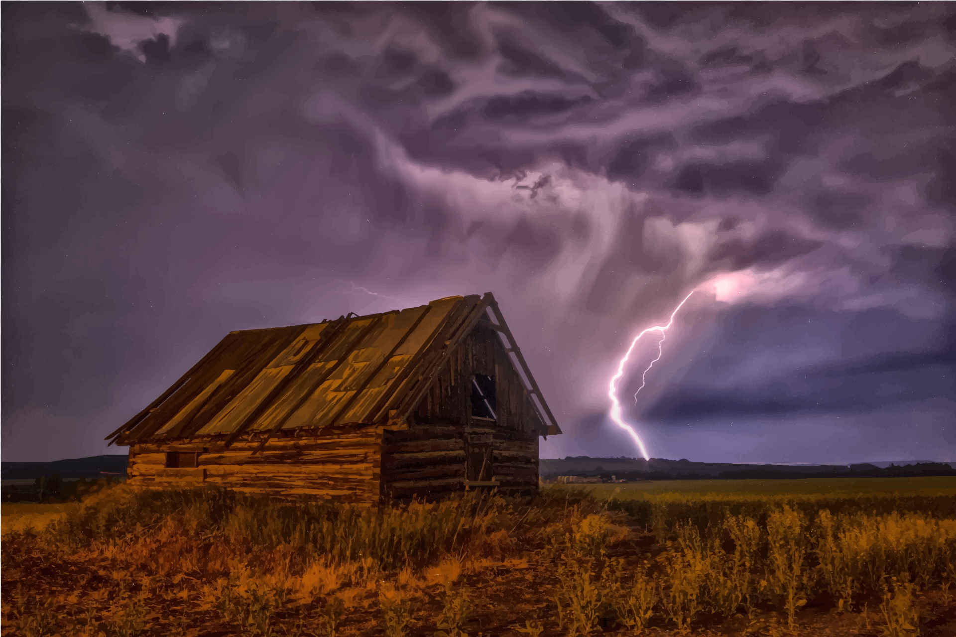 This features a small, old wooden cabin situated in the middle of a field. The cabin is surrounded by tall grass and has a rustic appearance. In the background, there are dark clouds looming overhead, indicating an approaching storm. A lightning bolt can be seen streaking across the sky, adding to the dramatic atmosphere of the scene.