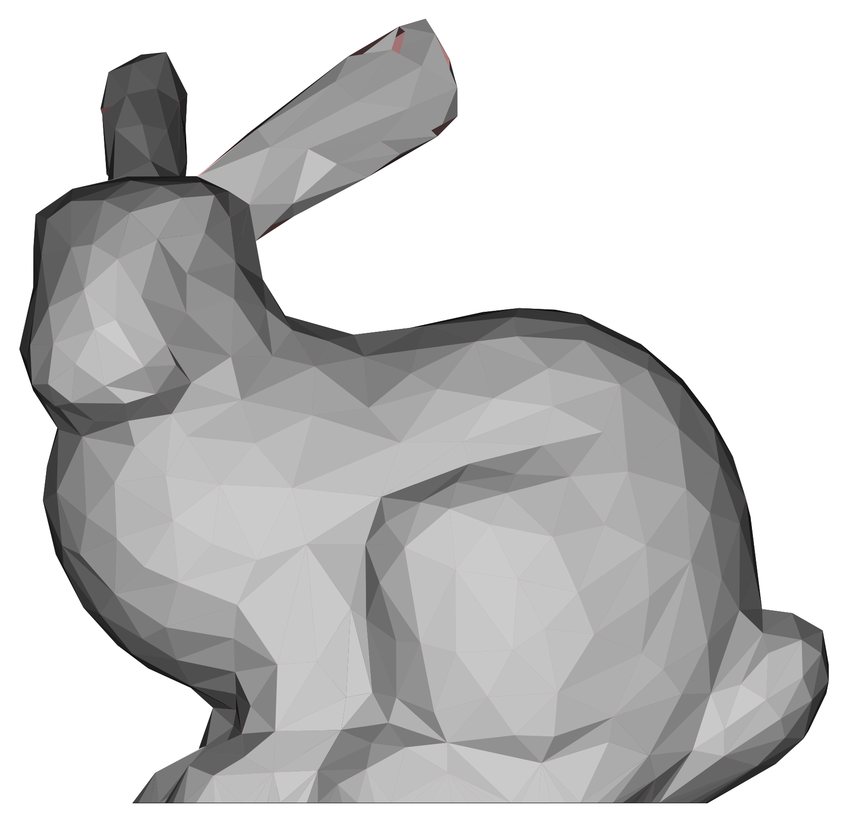 This features a 3D bunny with two long ears, sitting on the ground. It has a unique geometric pattern that gives it an interesting appearance. The bunny is gray in color and appears to be made of various shapes and lines, creating a visually appealing design. This digital representation of a rabbit adds a creative touch to any setting where it is displayed.