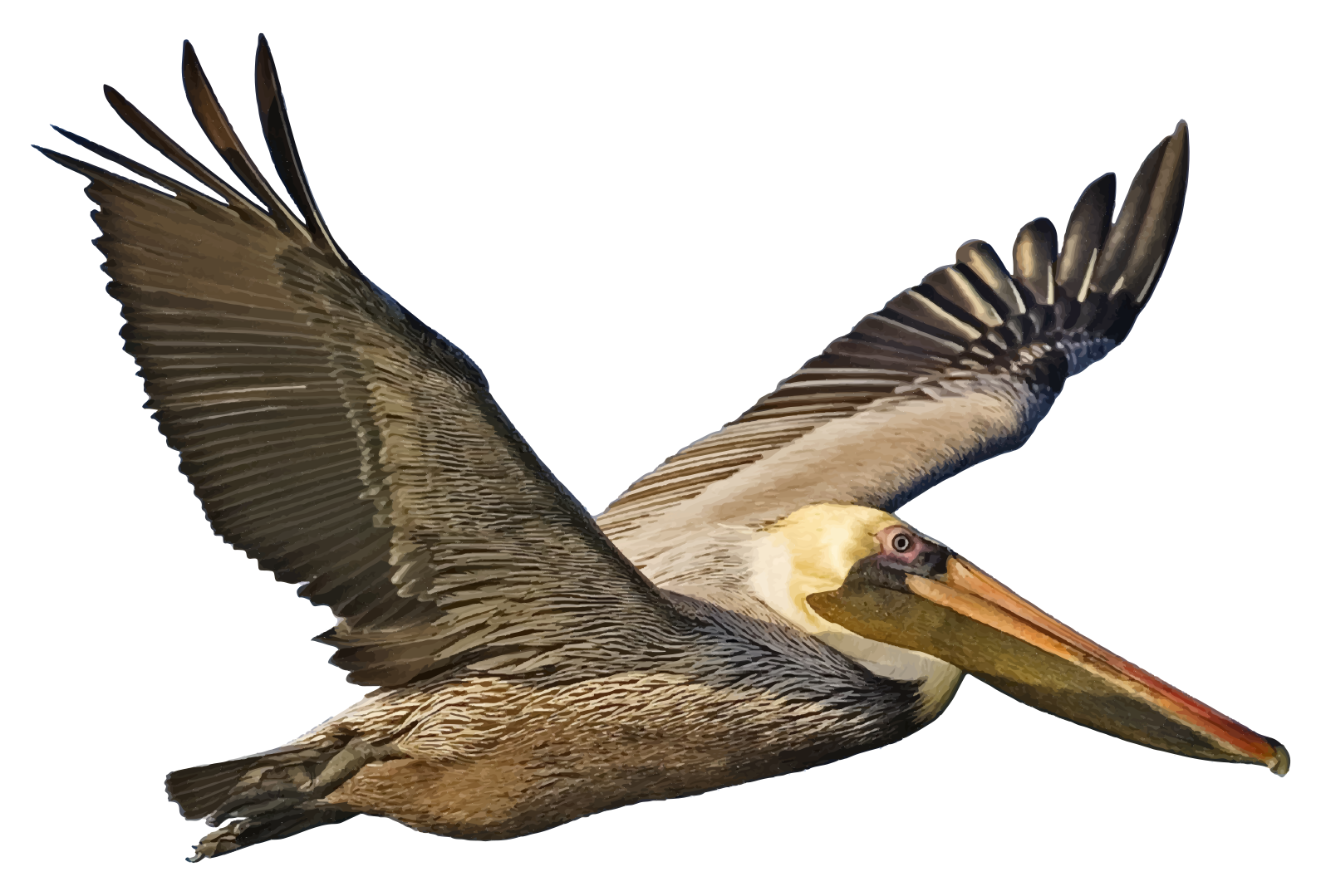 This features a large brown pelican flying through the air with its wings spread wide. It appears to be in motion, possibly taking off or landing. The bird's long neck and distinctive orange beak are clearly visible as it soars through the sky. This realistic representation of the pelican captures the beauty and grace of this majestic creature in flight.