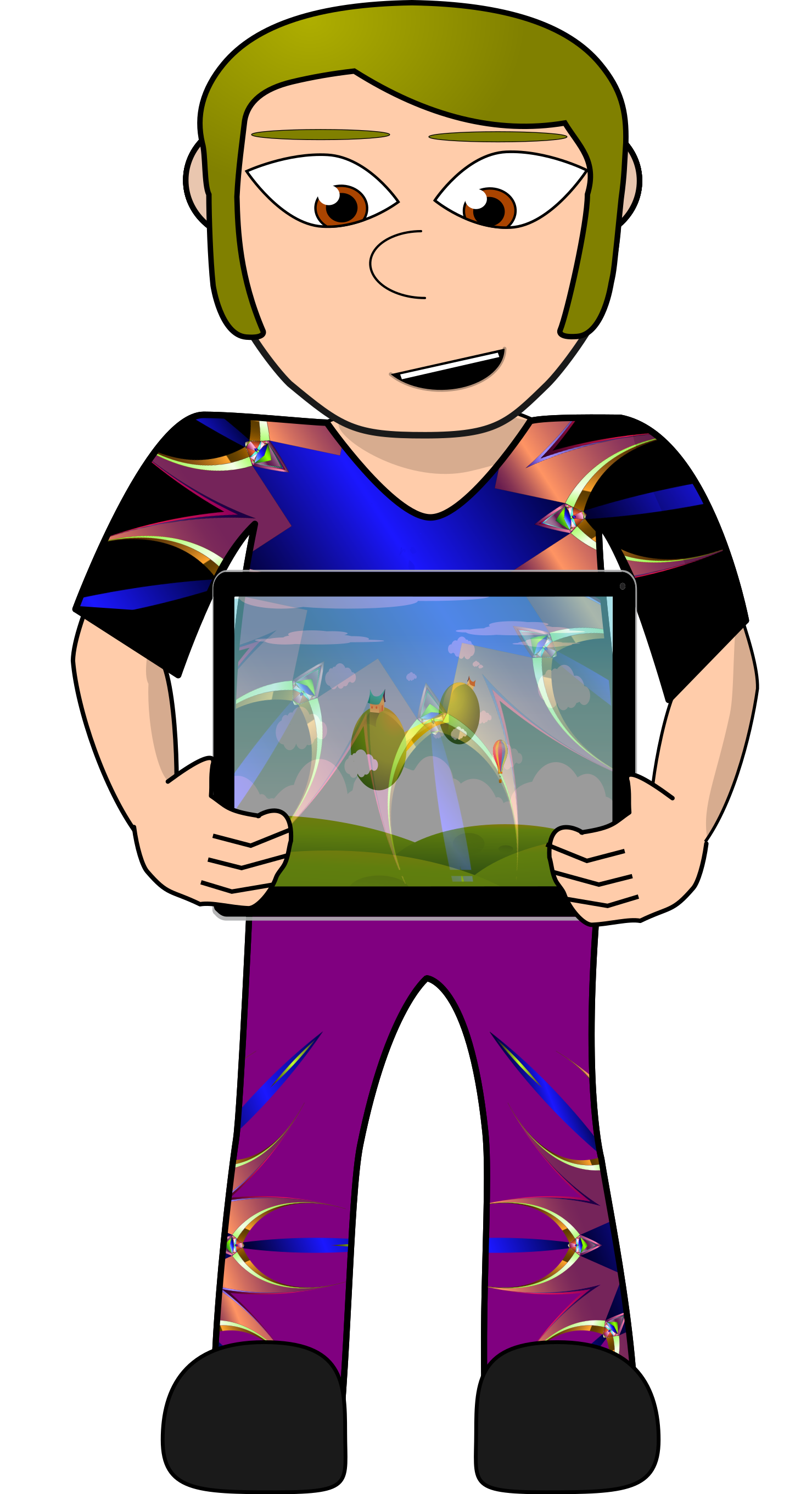 This features a cartoon man wearing purple pants with an orange and blue design. He is holding up a tablet computer, which displays a picture of three people on it. The man appears to be the main focus of the scene, as he stands in front of the screen while holding his device. The overall atmosphere suggests that this could be a promotional image or advertisement for a product or service related to technology and entertainment.