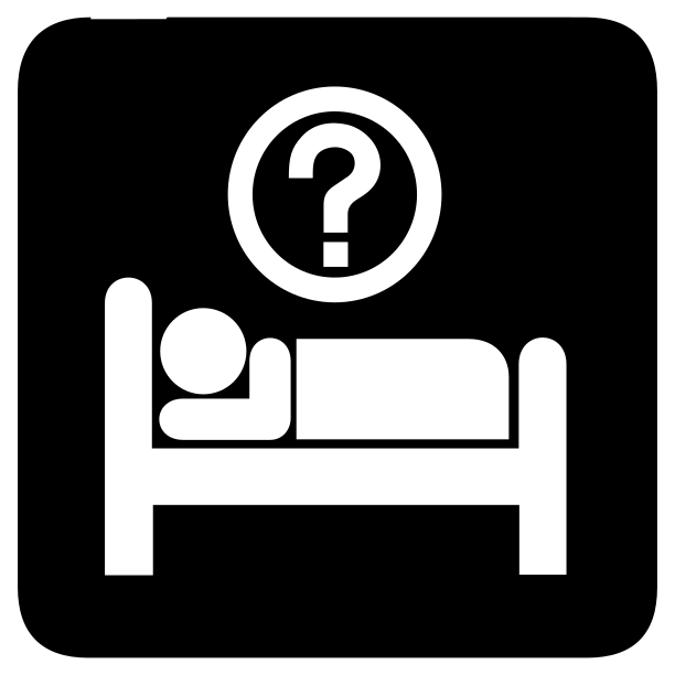 This features a black and white sign with a question mark symbol on it. The sign is placed above an illustration of a bed, which appears to be the main focus of the image. The bed has a person lying in it, possibly sleeping or resting. The overall composition of the image suggests that the sign may be related to travel or accommodations, as the bed represents a place where people can stay during their journeys.