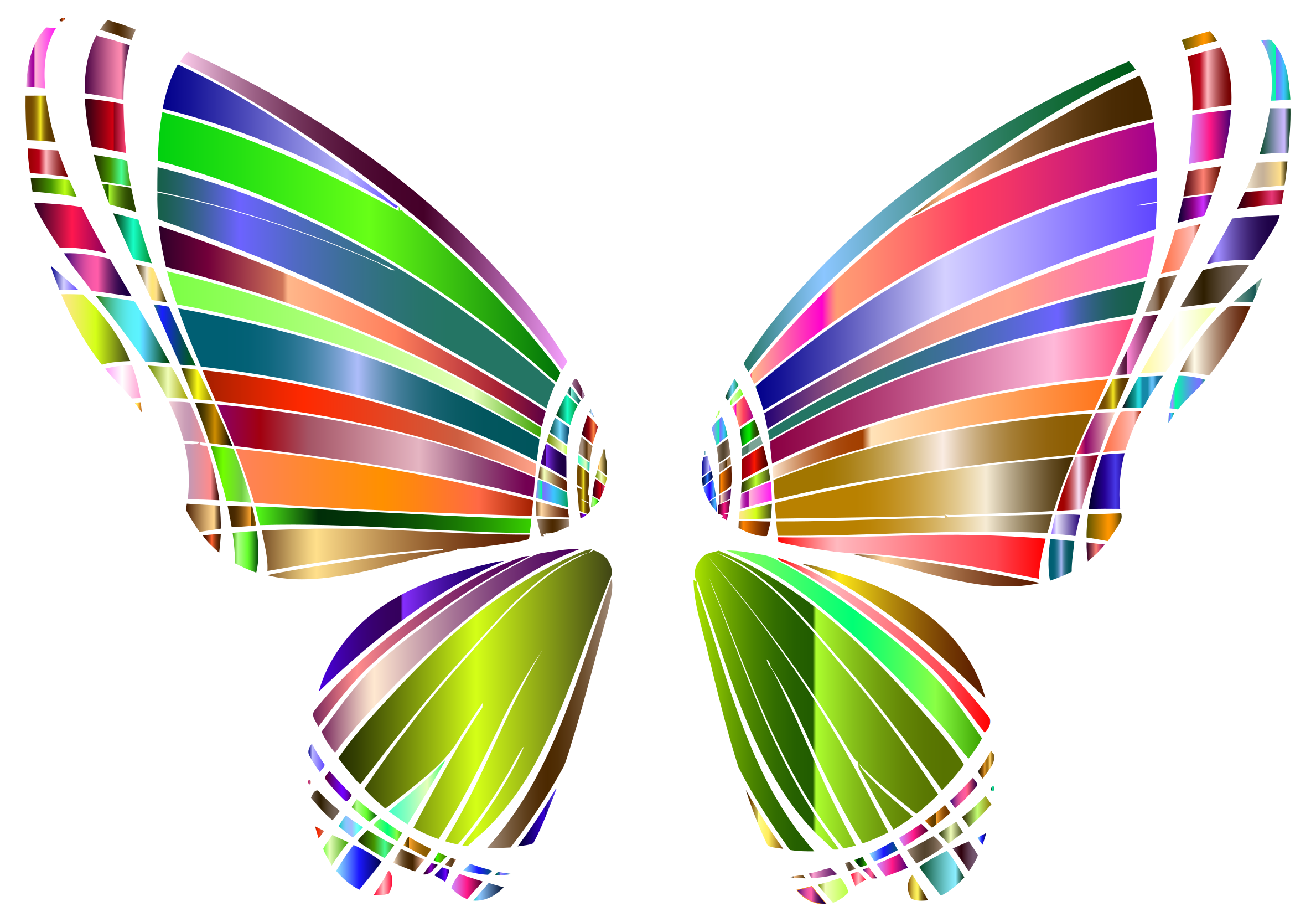 This features a pair of colorful butterfly wings, each with a white outline. These wings are made up of various colors, including red, green, yellow, blue, and purple. They create an eye-catching and vibrant display that is reminiscent of the rainbow. The wings are positioned close to one another, creating a sense of unity in their design. This artistic representation of butterfly wings showcases the beauty and diversity of colors found within nature.