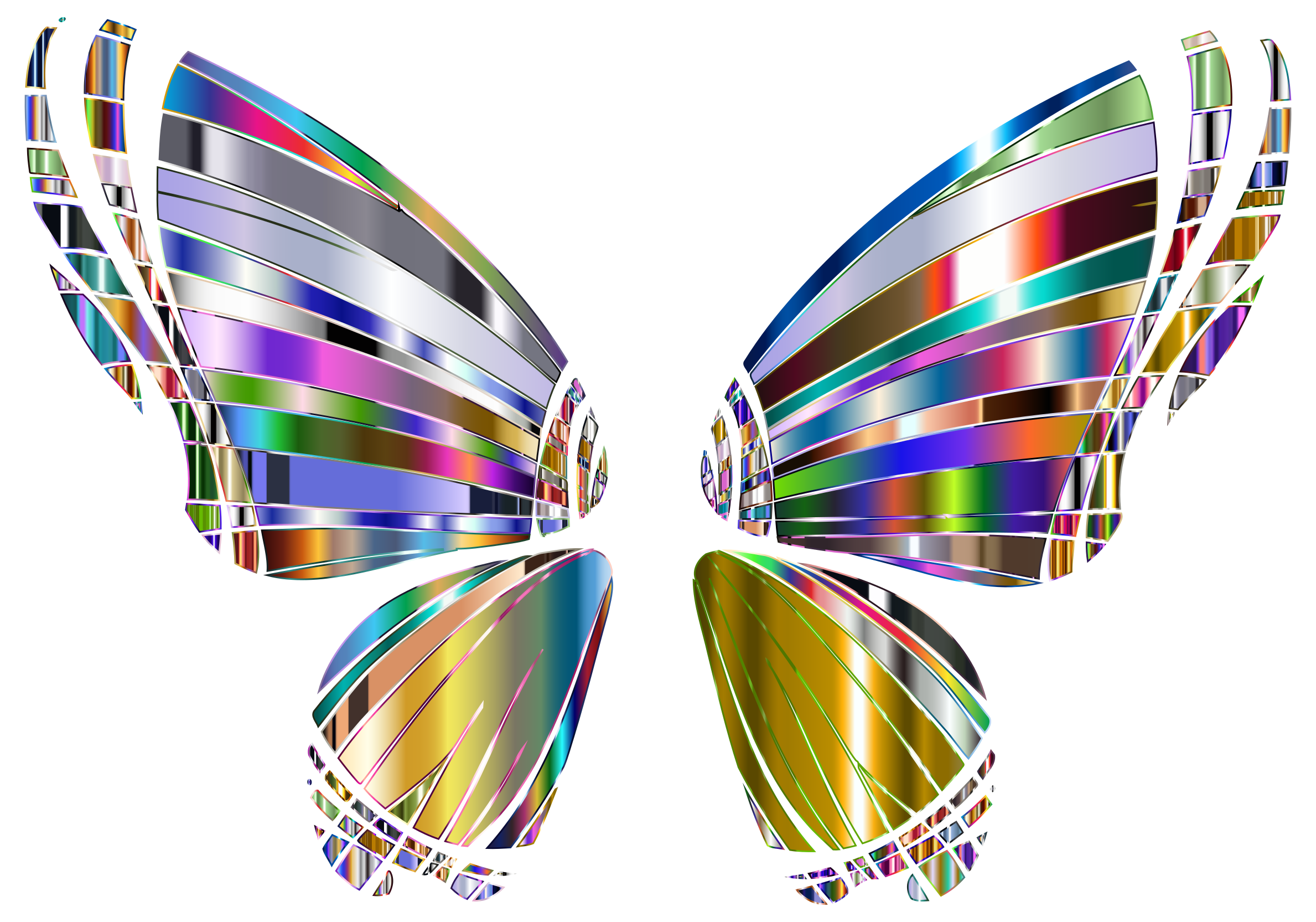 This features a pair of colorful butterfly wings, each with a white outline. These wings are made up of various colors, including blue, green, yellow, and orange. They create an eye-catching display that is reminiscent of the vibrant colors found in nature. The wings are positioned close to one another, creating a sense of depth and dimension within the image. Overall, this artistic representation of butterfly wings showcases their beauty and intricate design.