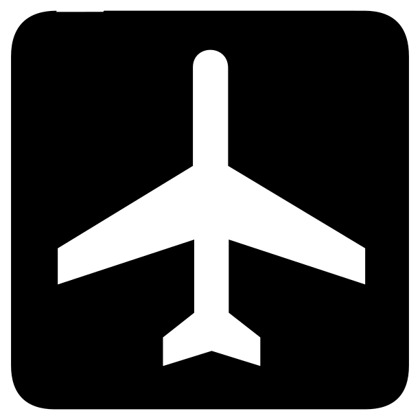 This features a black and white airplane symbol, which is an iconic representation of an airplane. This symbol is commonly used in various contexts such as airport signs or transportation-related materials. The airplane's wings are clearly visible, with one wing extending to the left side of the symbol and the other wing stretching across the right side. The overall design of the symbol is simple yet effective in conveying its meaning.