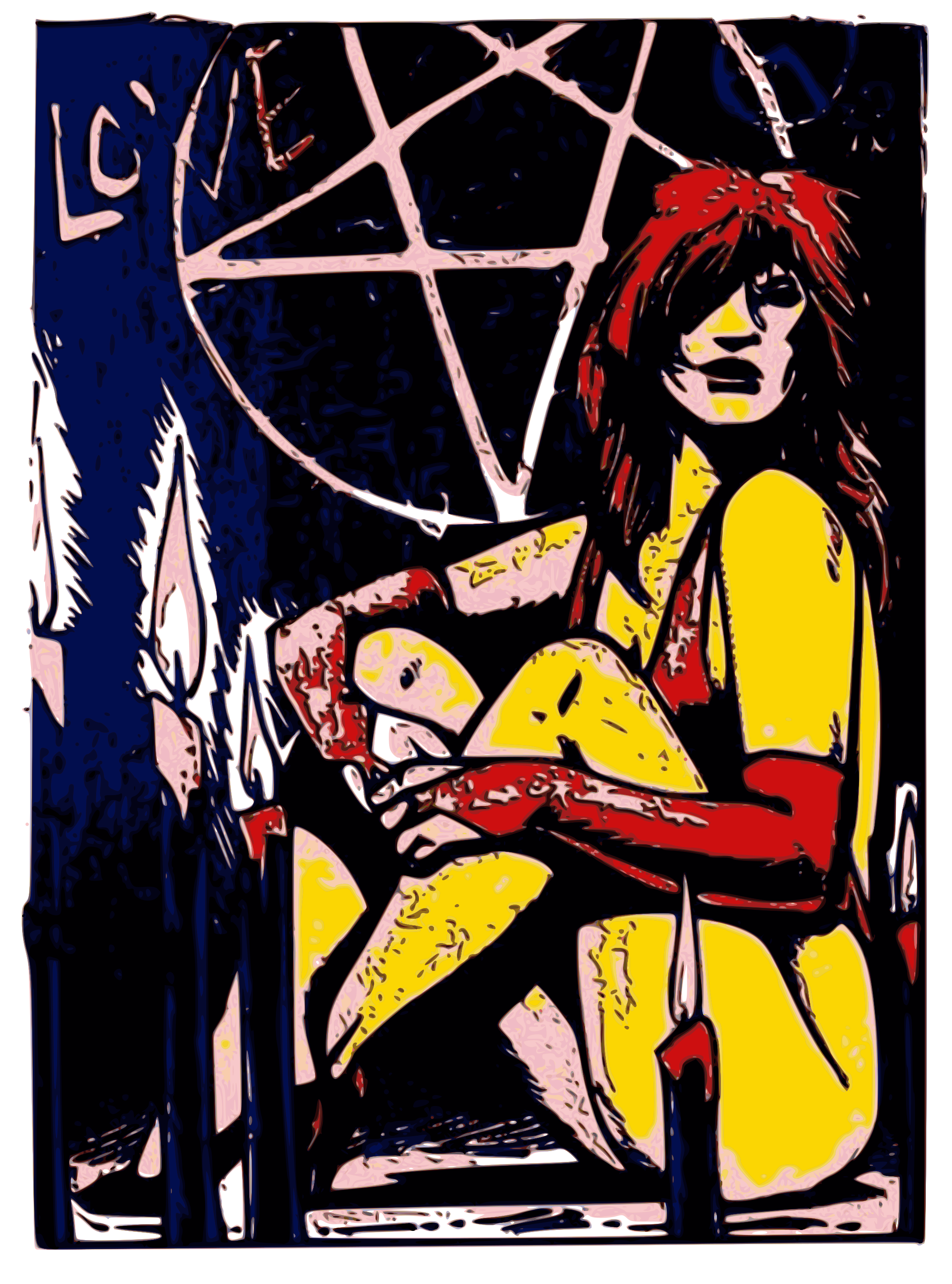 This is a black and yellow comic strip featuring a woman sitting on a chair. She appears to be wearing a red dress, and there are several candles around her. Some of the candles are placed near her feet while others are closer to her upper body. The scene has an artistic and creative feel with the combination of colors and the presence of candles. It seems like the woman is either posing for the picture or engaging in some form of ritual or ceremony, as suggested by the presence of a pentagram on the wall behind her.