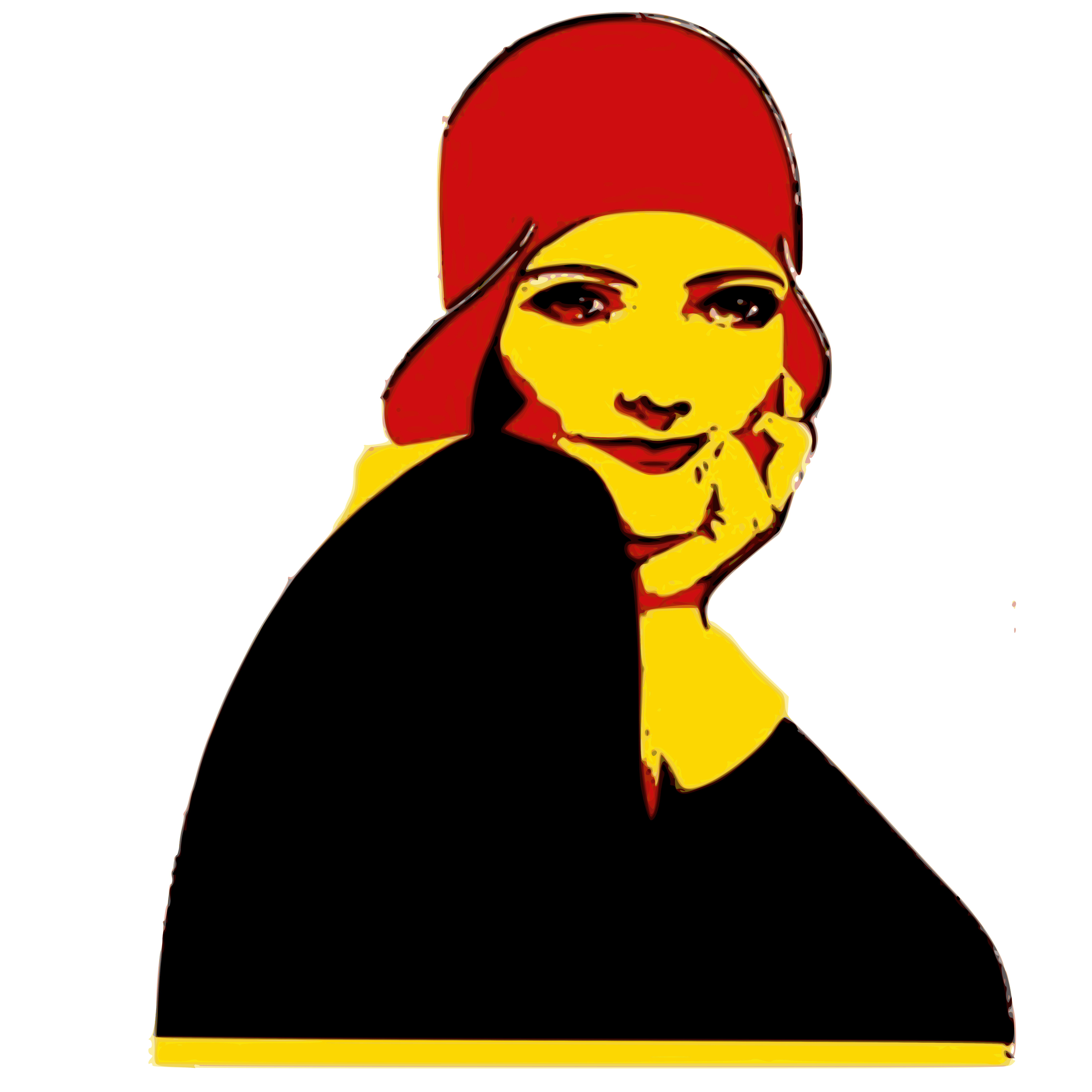 This features a woman wearing a red hat and black clothing, with her hands on her chin. She appears to be posing for the camera in a vintage style reminiscent of the 1920s Charleston pin-up era. Her facial expression is one of contemplation or thoughtfulness, as she looks off into the distance. The woman's outfit and hairstyle suggest that this image was created during a time when such styles were popular. Overall, the image captures a moment in history with a sense of nostalgia and charm.